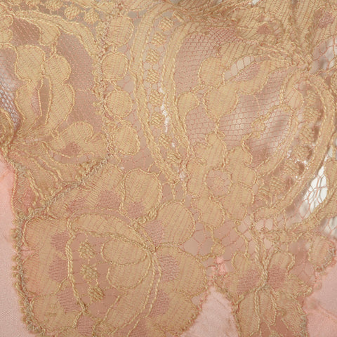 The textile of this jumpsuit is unmarked, pink silk, with lace trim and is very lightweight. This jumpsuit is sleeveless with a v neck, a tie back ...