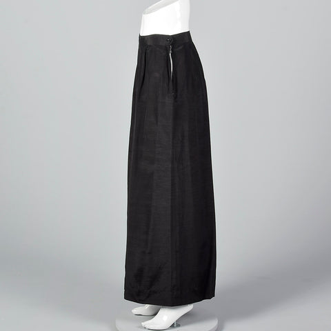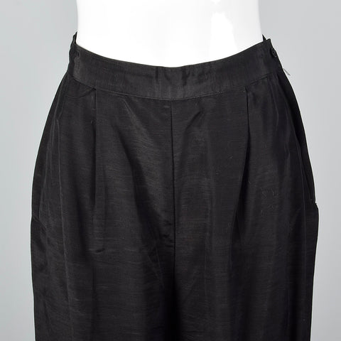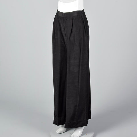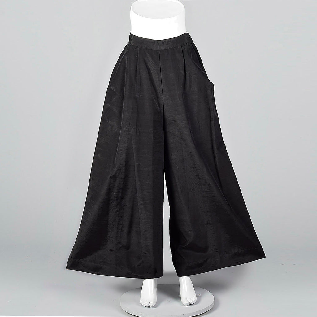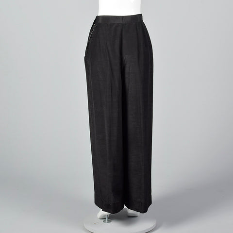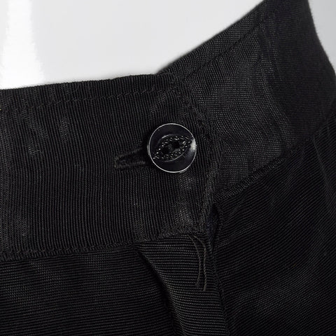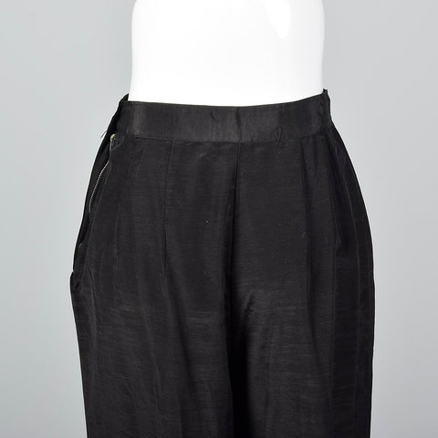 The silhouette of these late 1930s pants is amazing! The textile of these pants is unmarked, black with a slight sheen, and is very lightweight. Th...