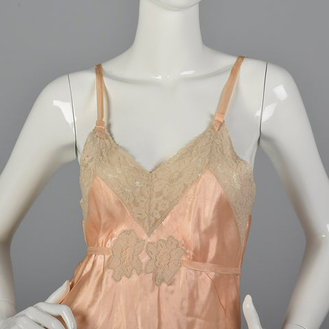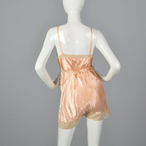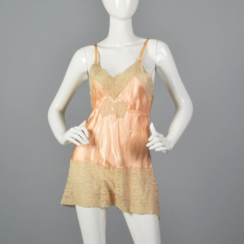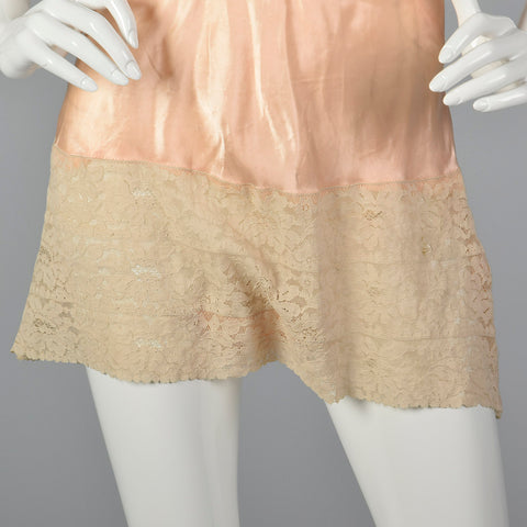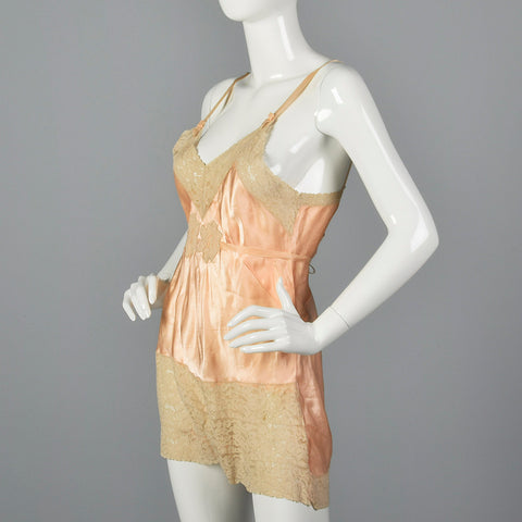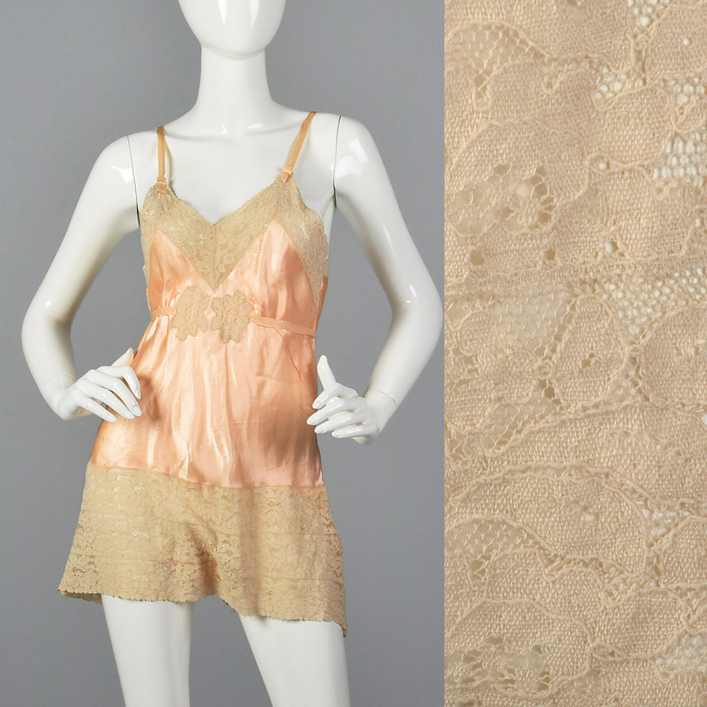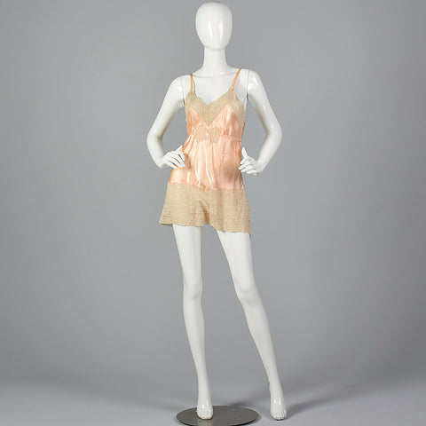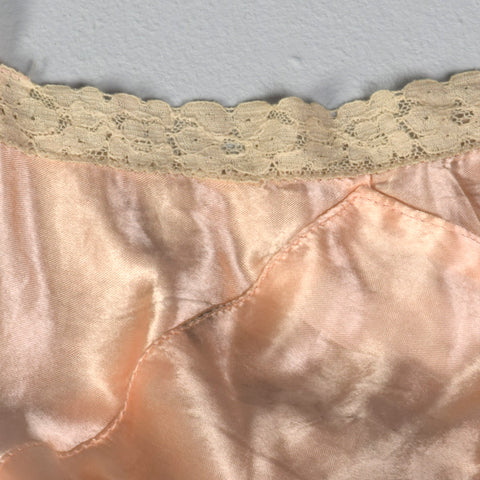 This listing is for one slip. Textile is unmarked, rayon. Pink slip with button crotch. Lace around bust and hemline with two front lace appliques....