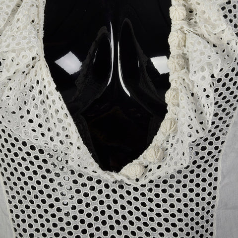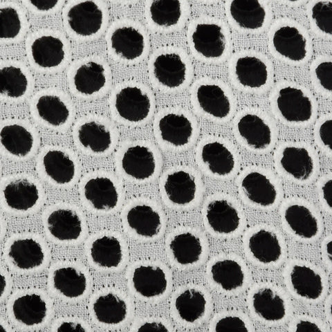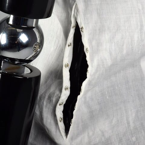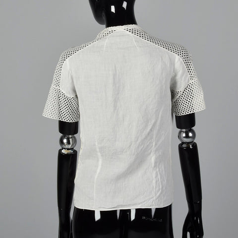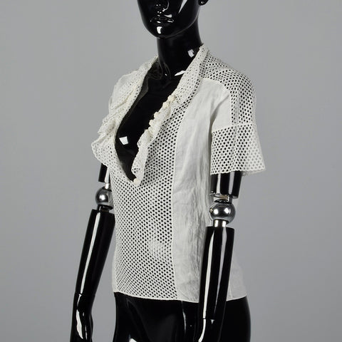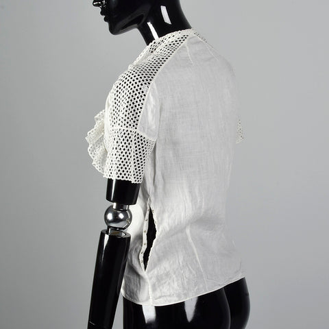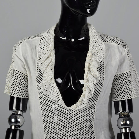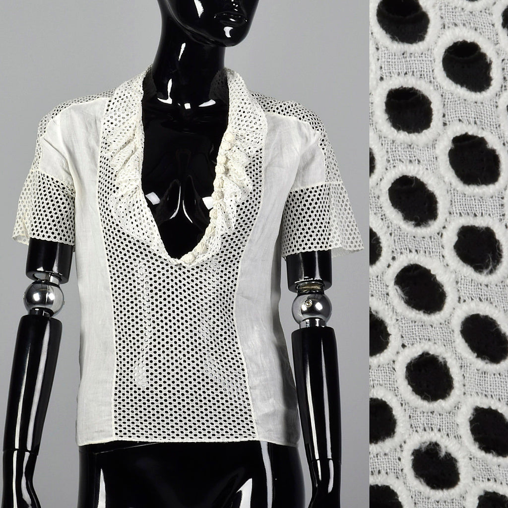 The textile of this blouse is unmarked, white, and is lightweight. This blouse has short sleeves, a ruffled collar, and sheer eyelet panels down th...