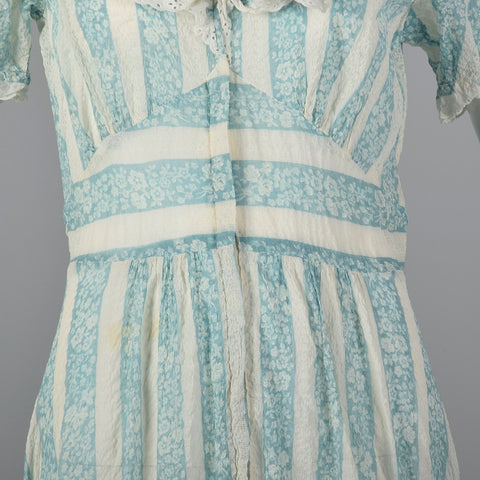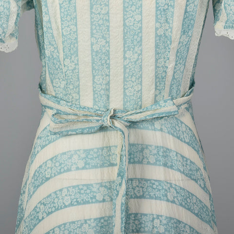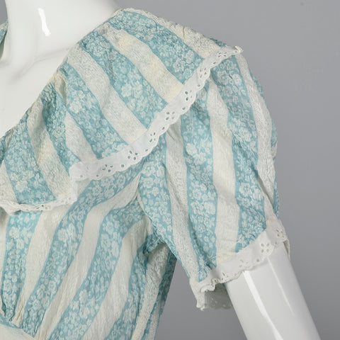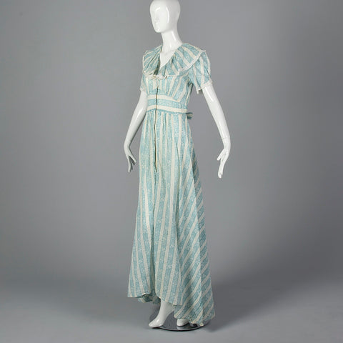 The textile of this dressing gown is unmarked in blue and white stripes and is very lightweight. This dressing gown is unlined with short sleeves, ...