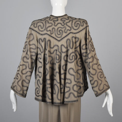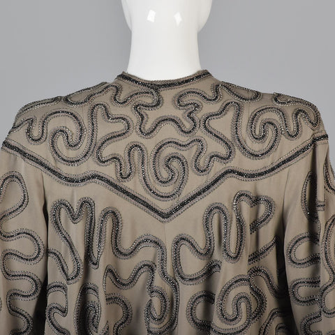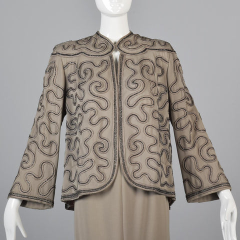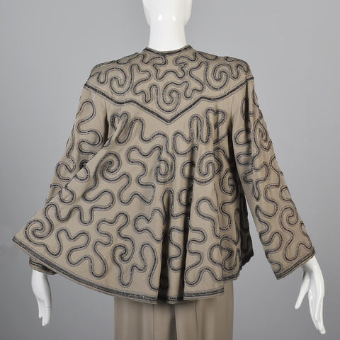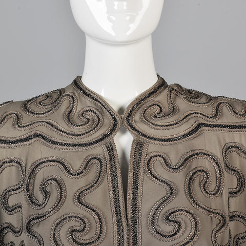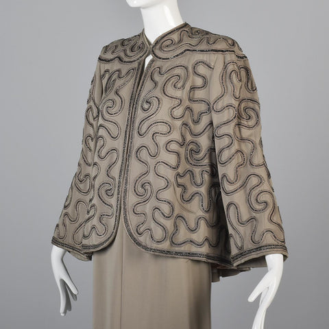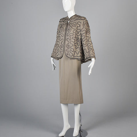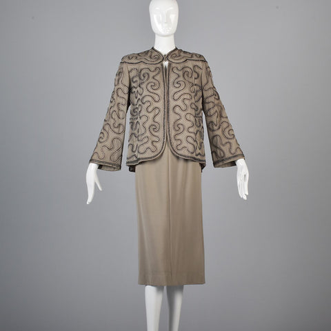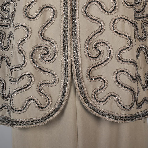 This suit includes 1 skirt and 1 jacket. The textile is unmarked, wool gabardine. The jacket is absolutely incredible! Hand stitched soutache is be...