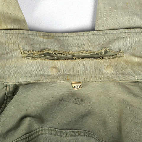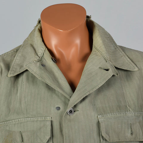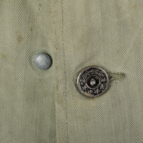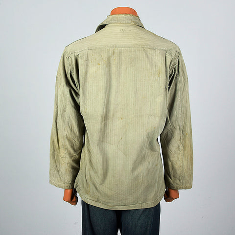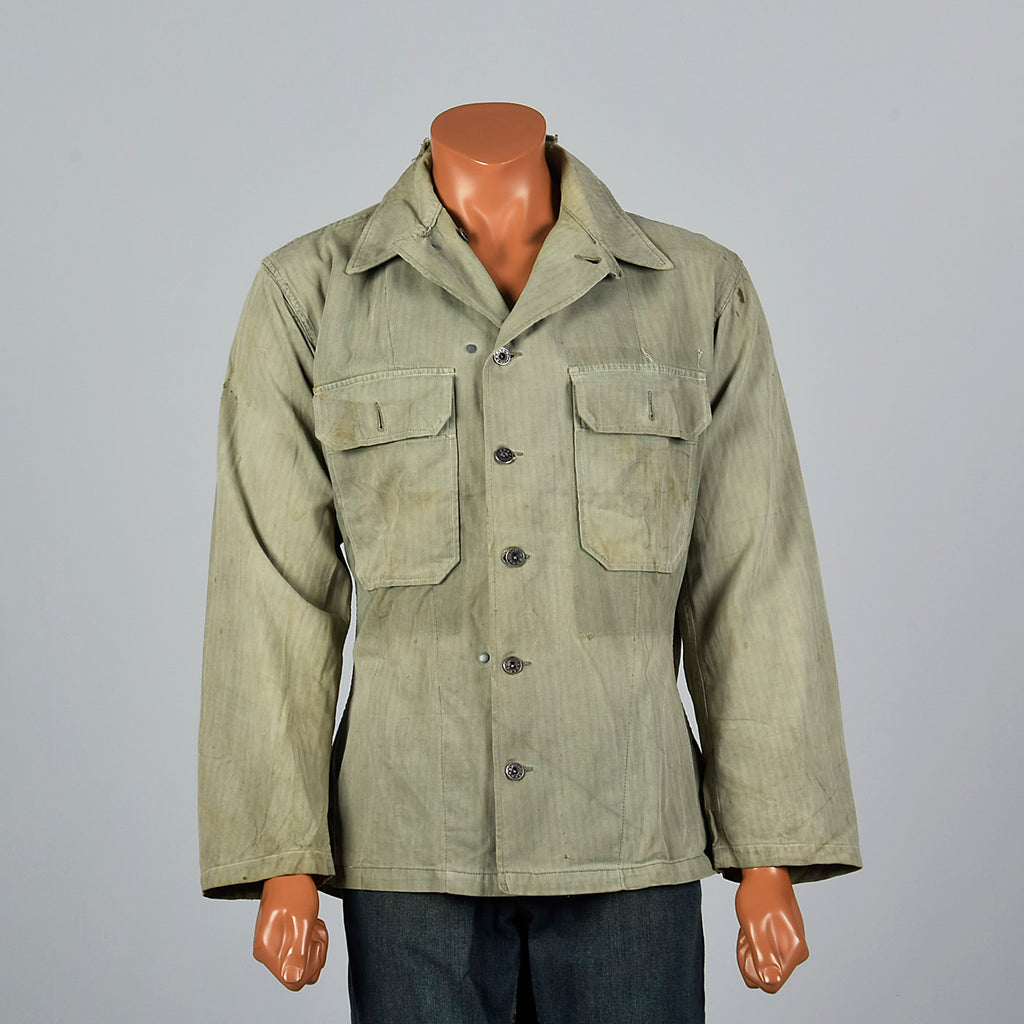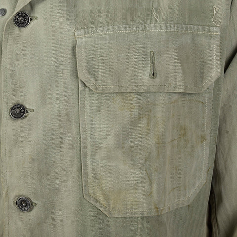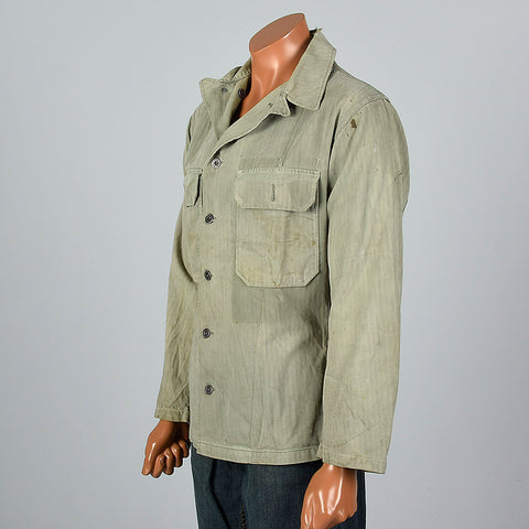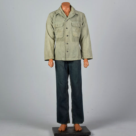 This listing is for one jacket. Textile is unmarked. US Army Shirt. Light green with long sleeves. Herringbone twill. Donut rivets down front and o...