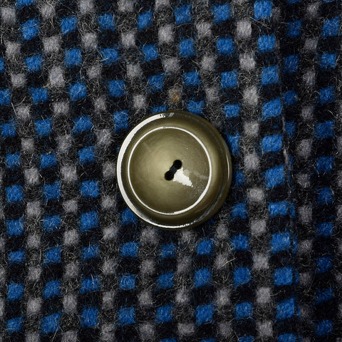 The textile of this jacket is unmarked, blue and gray wool tweed. This jacket has long sleeves, a collar with wide lapels, a button front, and two ...