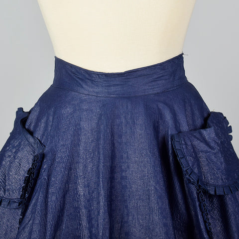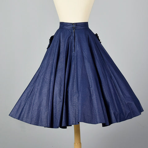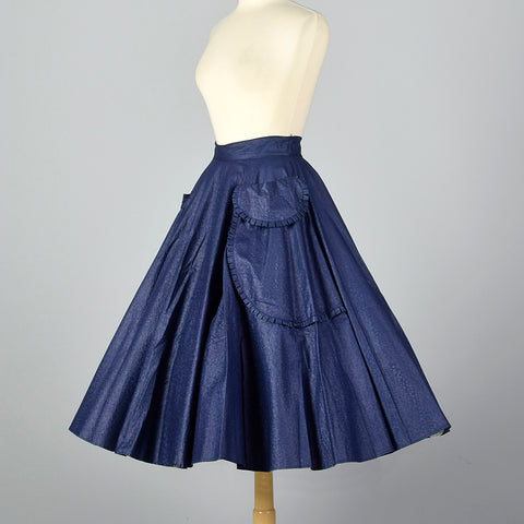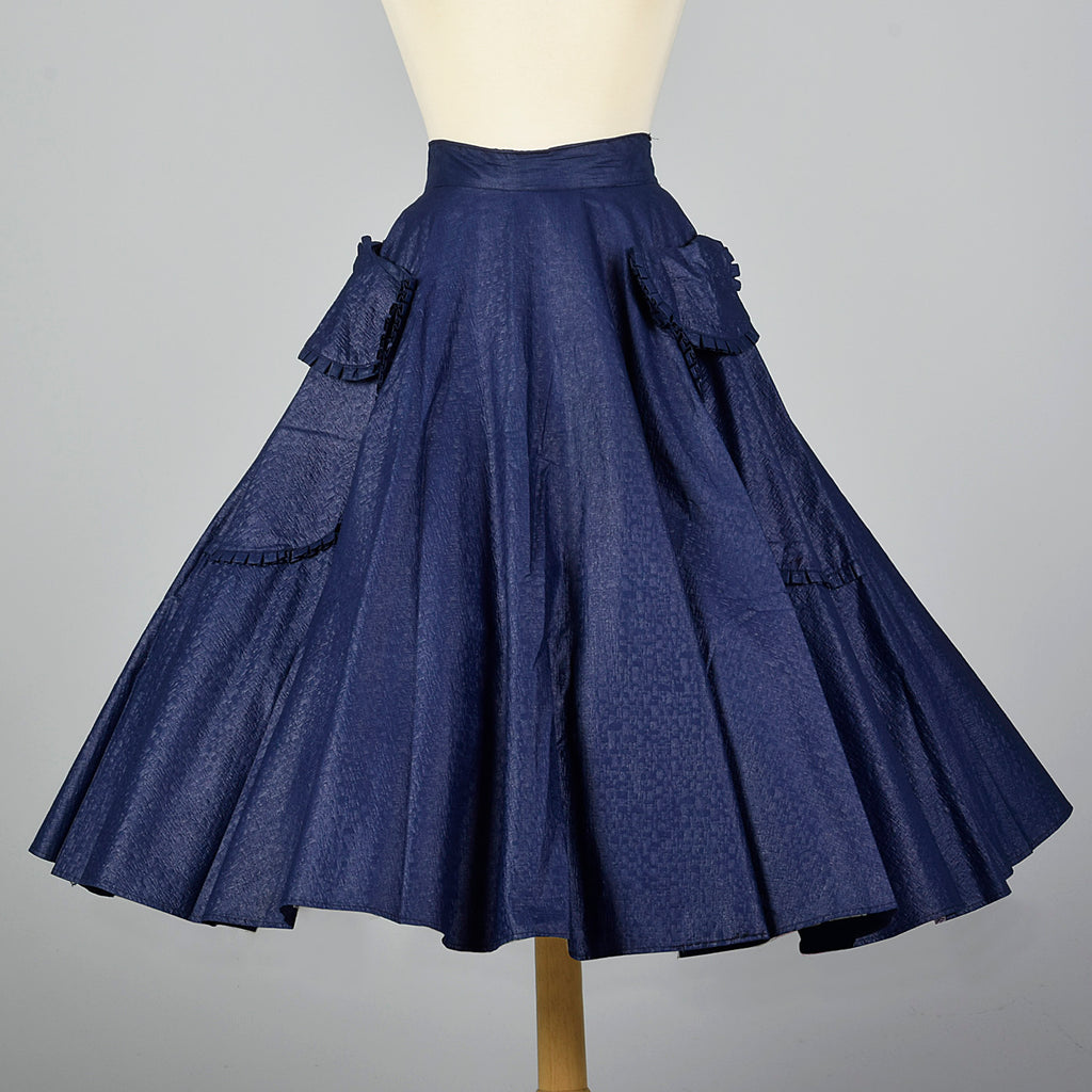 This listing is for one skirt. Textile is unmarked. Circle skirt with patch pockets. Blue full circle skirt with large patch pockets. Pleated trim ...
