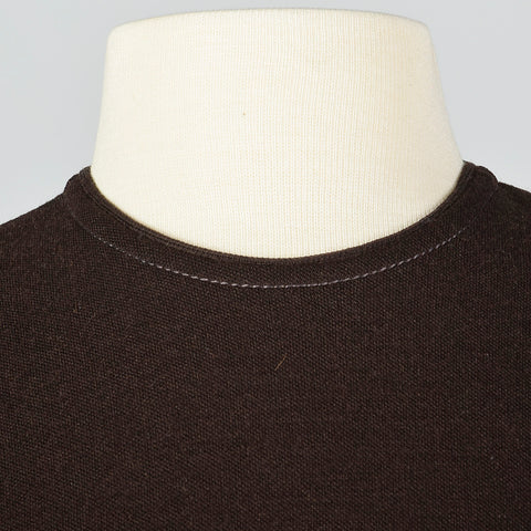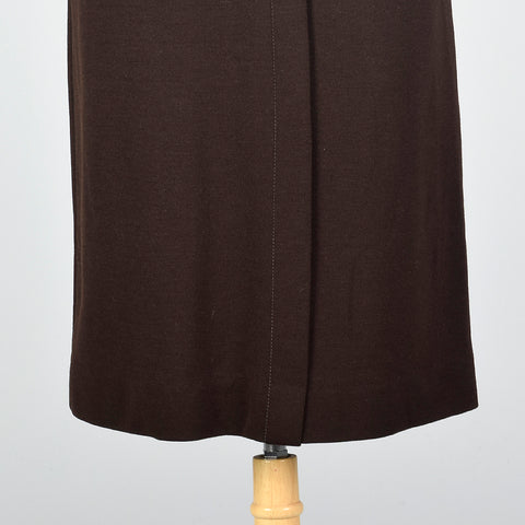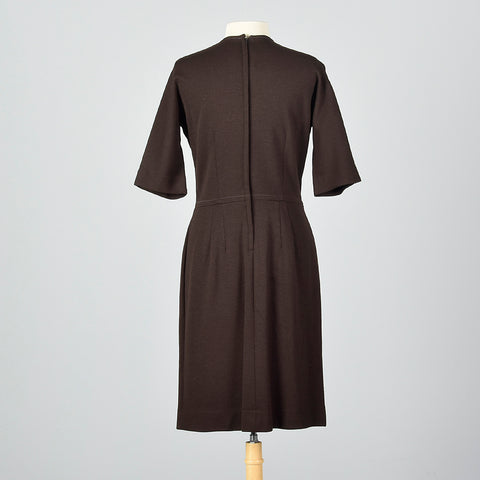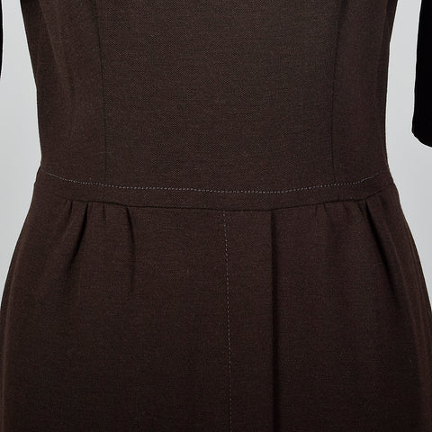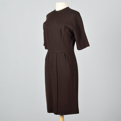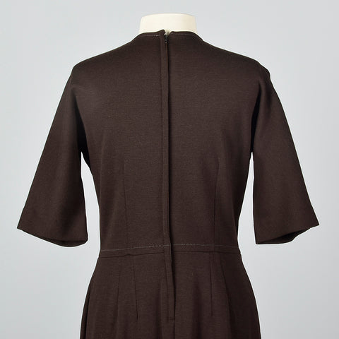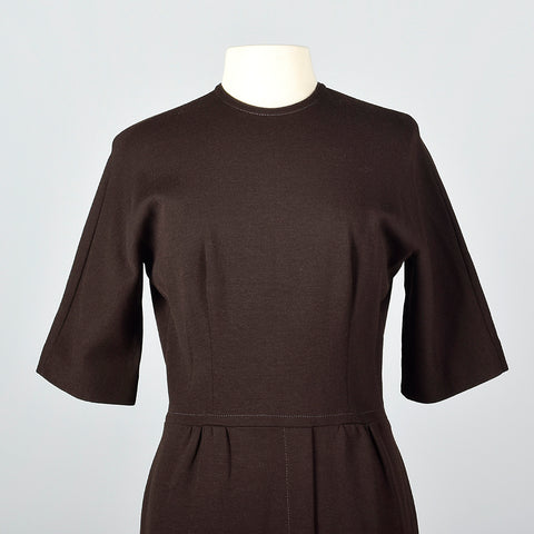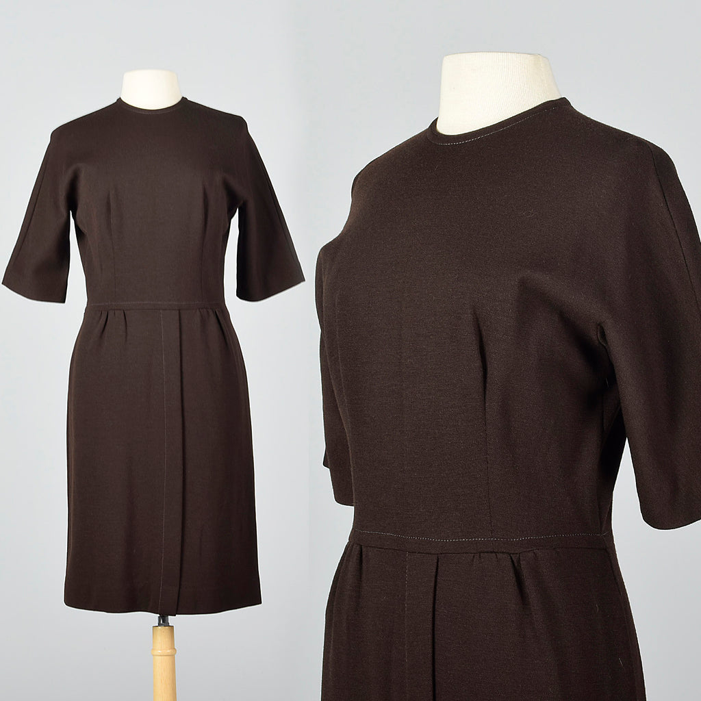 The textile of this dress is unmarked, brown knit, and does have some stretch. This dress is unlined with elbow length sleeves, a fitted waist, and...