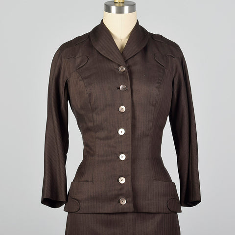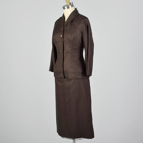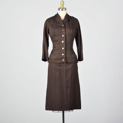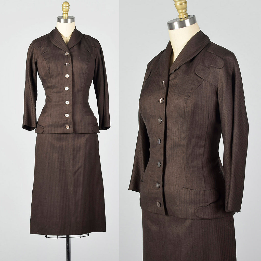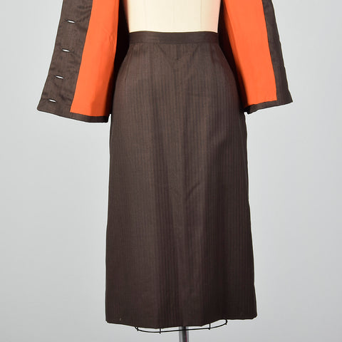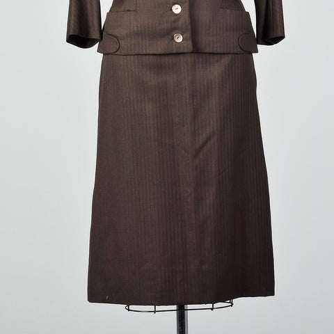 This listing is for one skirt suit consisting of one skirt and one jacket. Two piece skirt suit. Brown with small subtle stripes in the textile. Li...