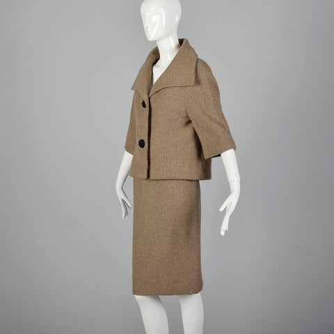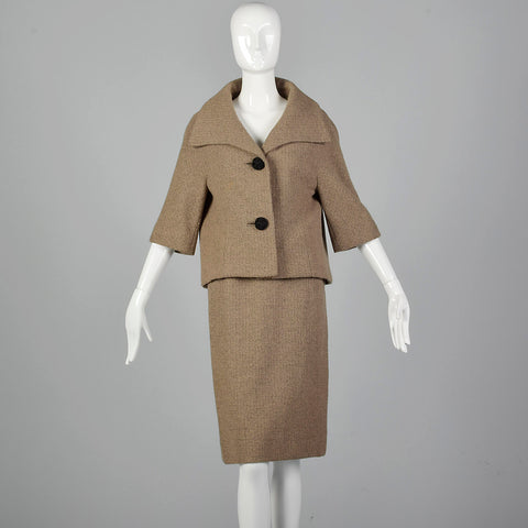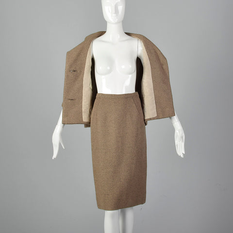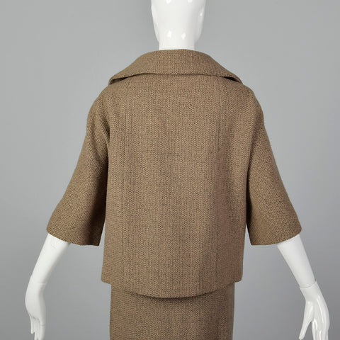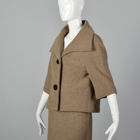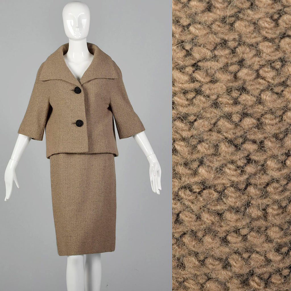 This listing is for one skirt suit consisting of a skirt and jacket. Textile is unmarked. Brown woven skirt suit. Jacket has a loose fit. Wide coll...