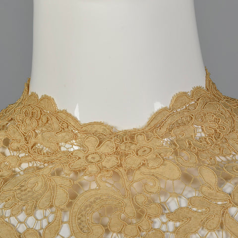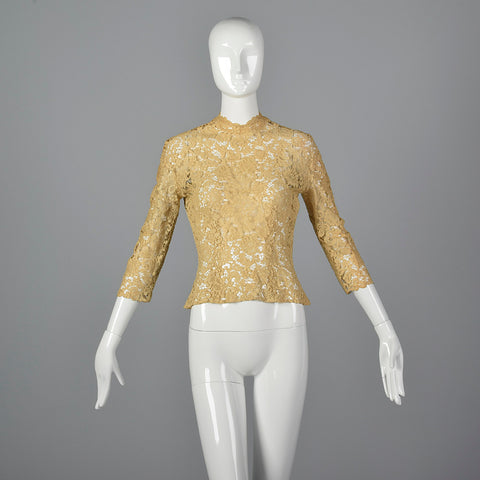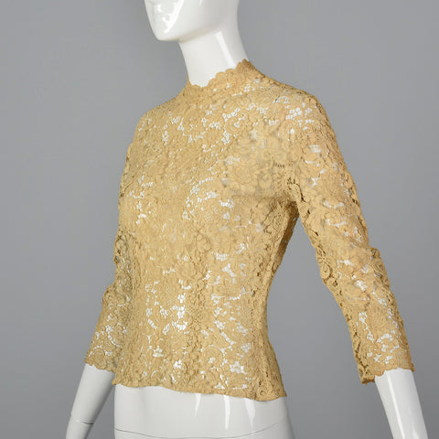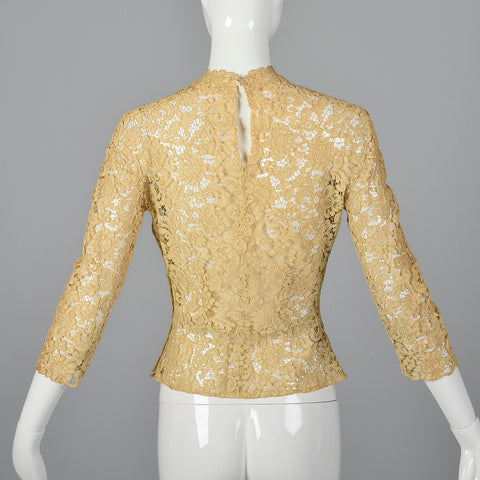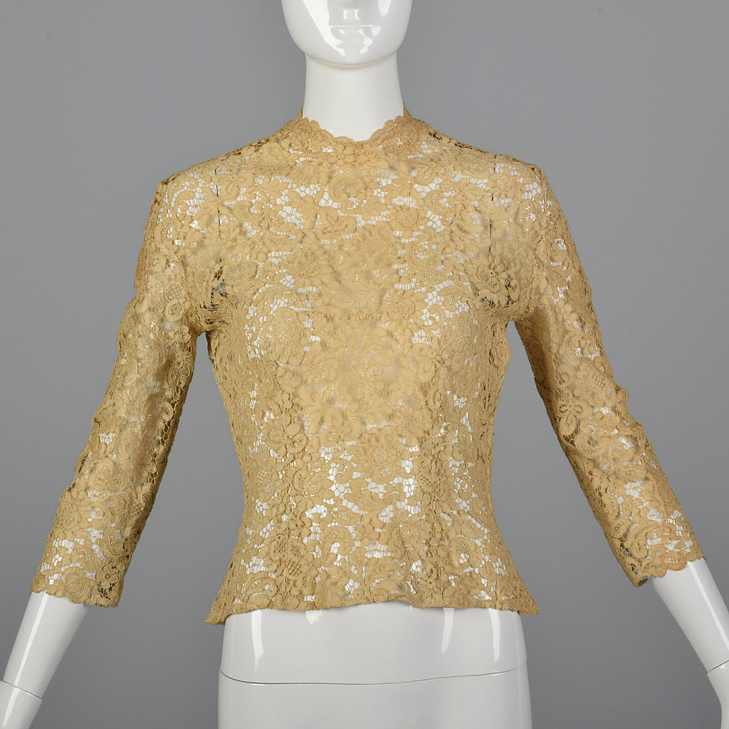 This listing is for one shirt. Textile is unmarked. Cream lace top with 3/4 length sleeves. Made from beautiful floral pattern lace. Zips on the le...