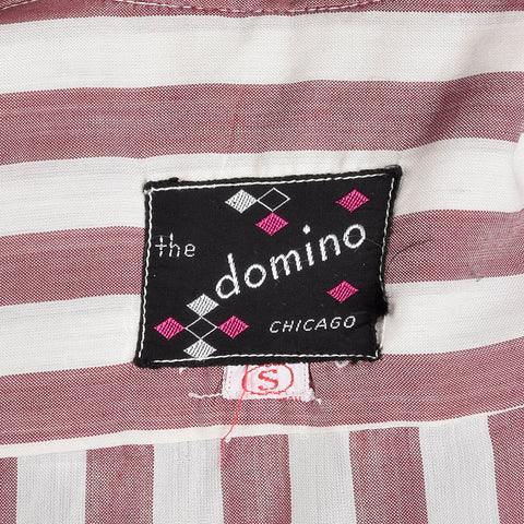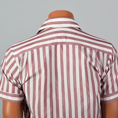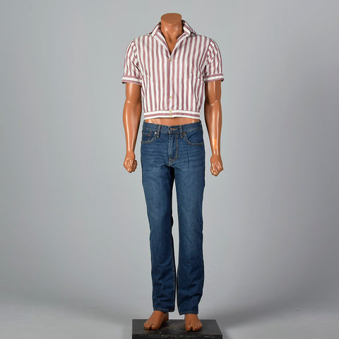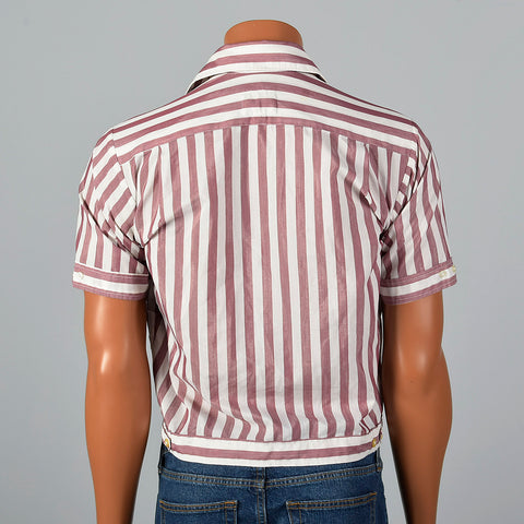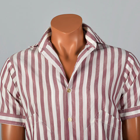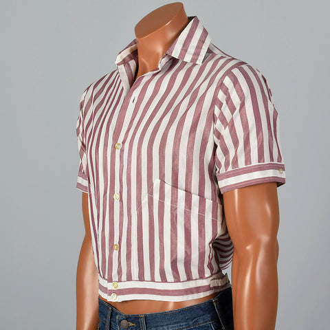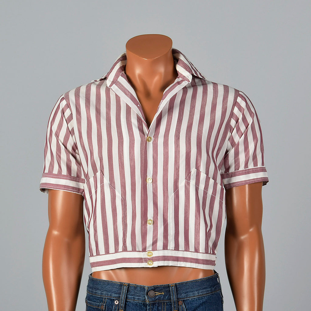 This listing is for one shirt. Textile is unmarked. Mens cropped shirt. Red and white stripes. Spread collar, two slanted pockets, adjustable waist...