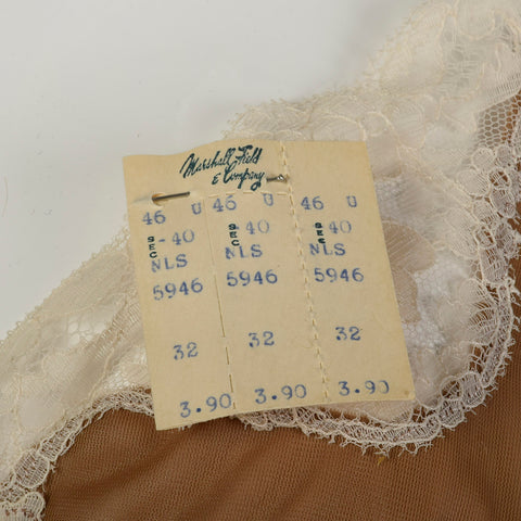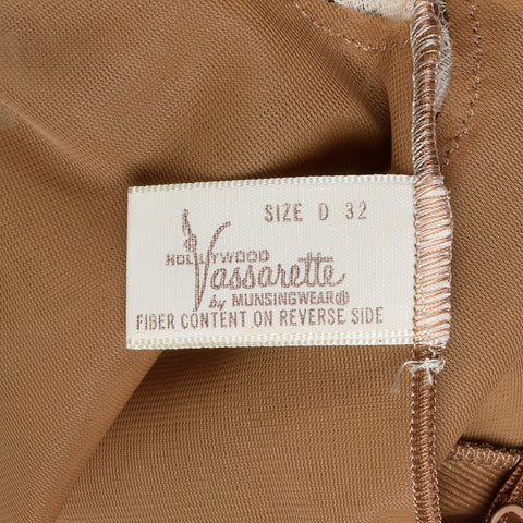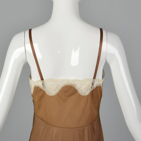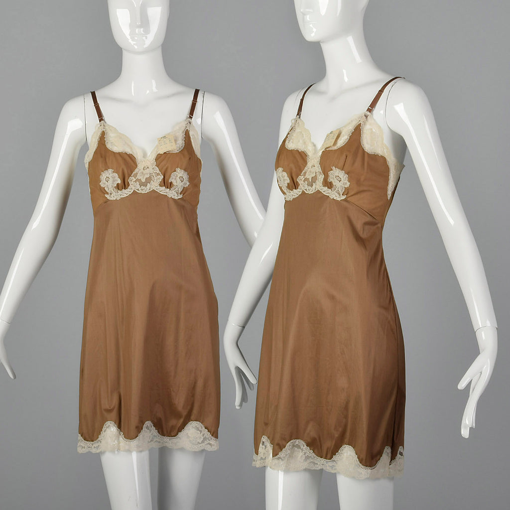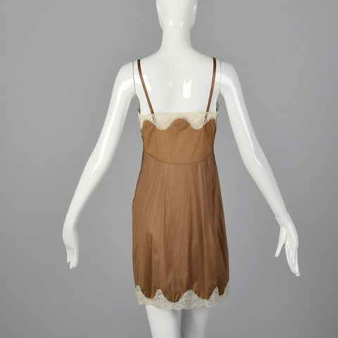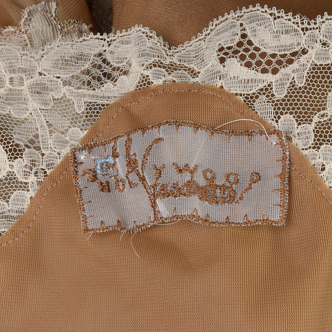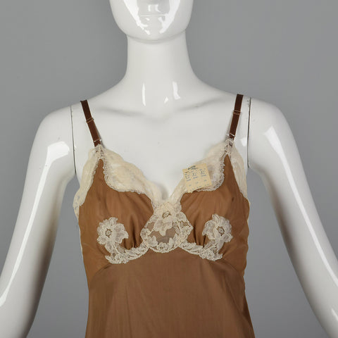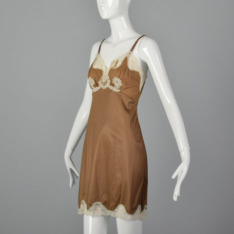 The textile of this slip is 100% nylon in brown with white lace time. This full slip has adjustable straps and lace trim at the bust and hem. Size...