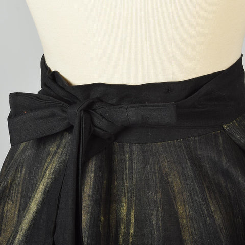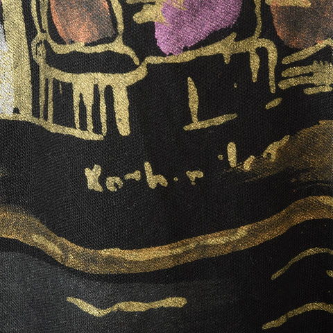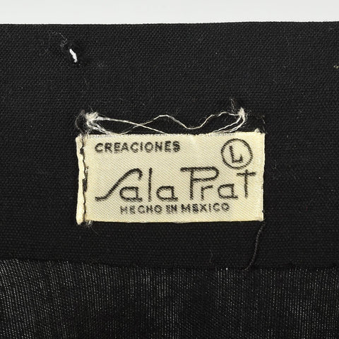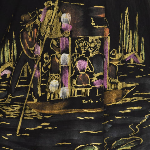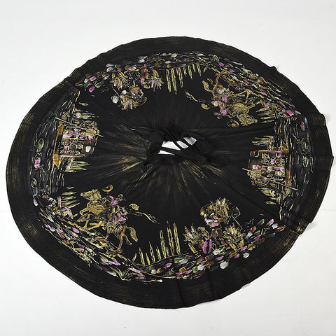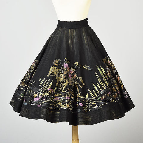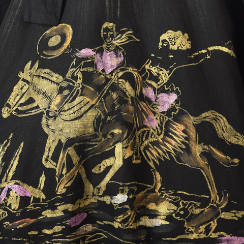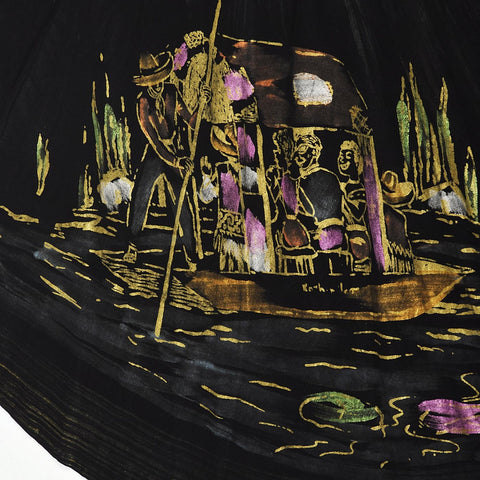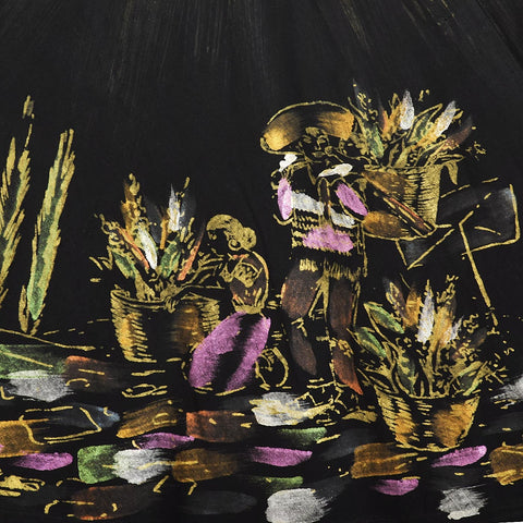 The textile of this black circle skirt is not marked, but it is most likely cotton. Hand painted design shows numerous scenes of Mexico. The waistb...
