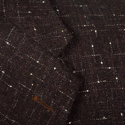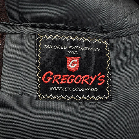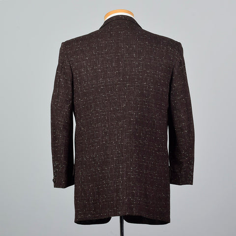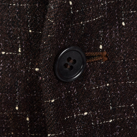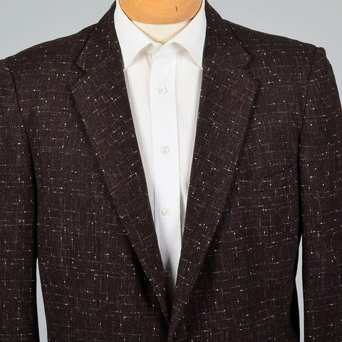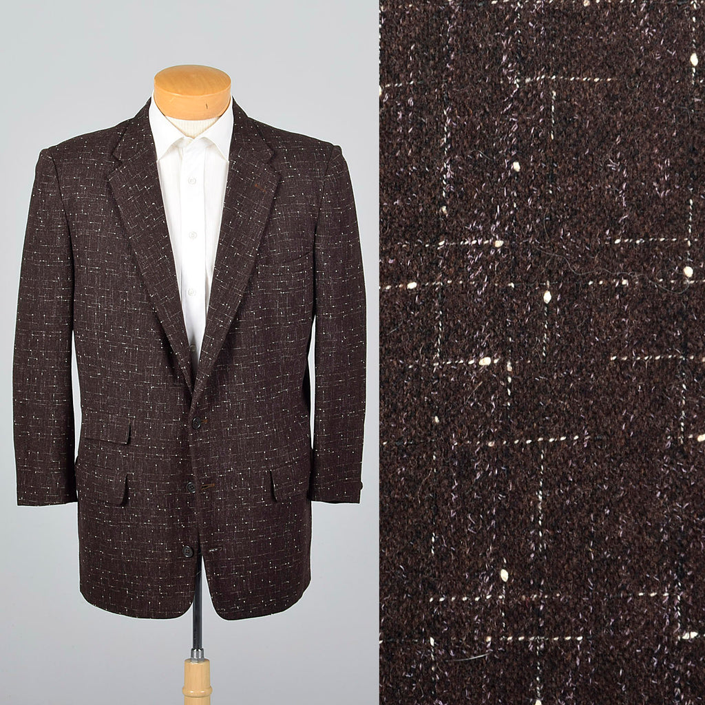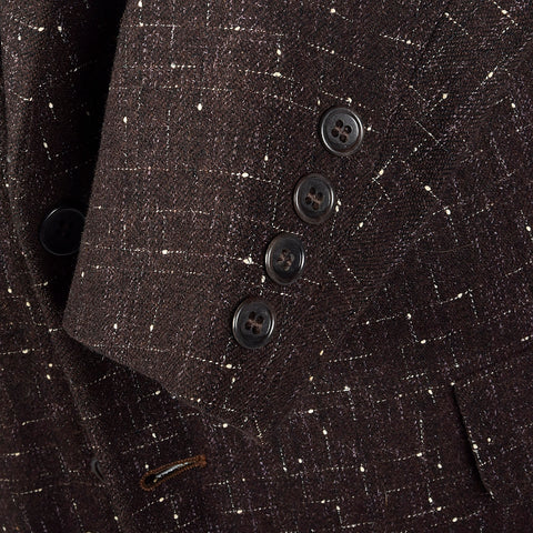 The textile of this jacket is unmarked, brown, with a white atomic fleck textile. This jacket has medium width lapels, a three button closure (with...