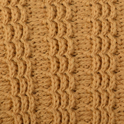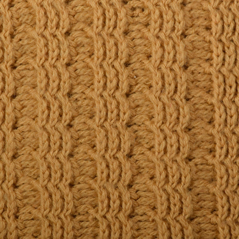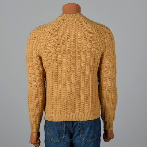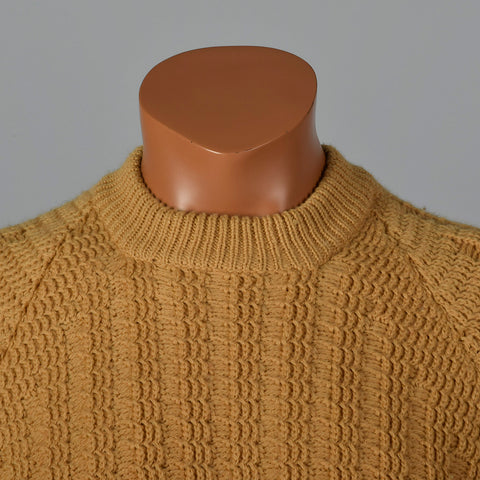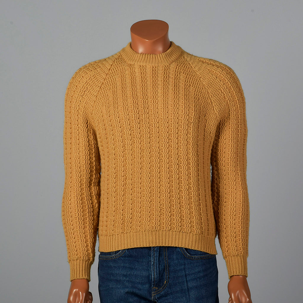 The textile of this mens sweater is 100% wool in a gold chunky knit. This sweater is a pull over style with a round neck, long sleeves, and ribbed ...