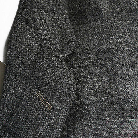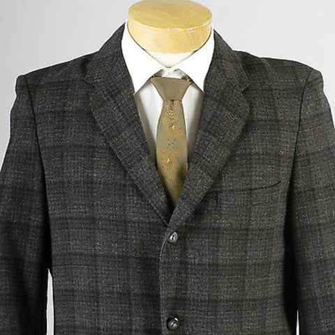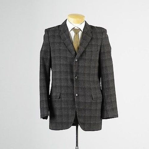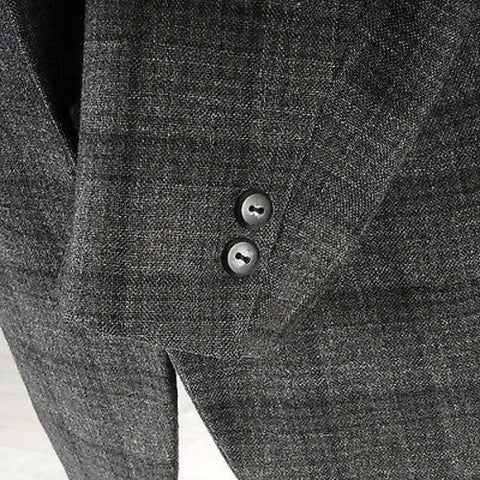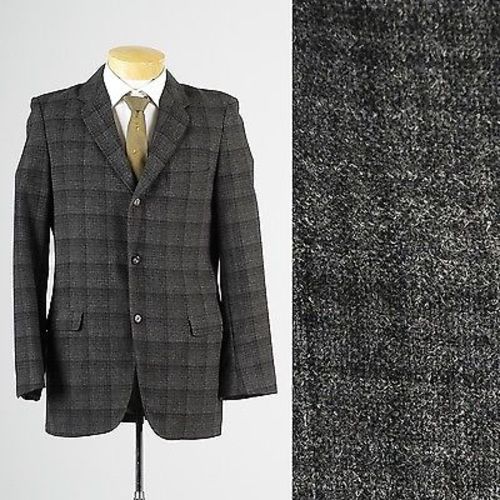 This jacket is sharp! The fabric is a gray and charcoal gray windowpane plaid. This jacket has slim, rounded lapels, a three button front, a single...