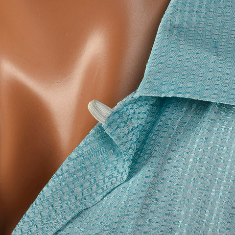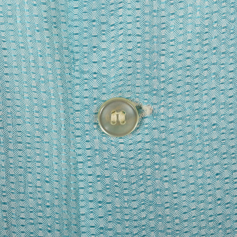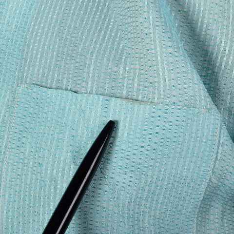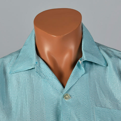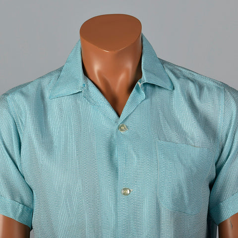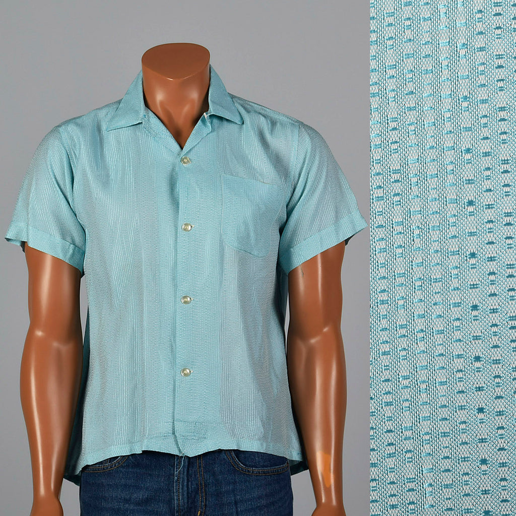 The textile of this shirt is rayon in blue. This shirt has short sleeves, a loop collar, one chest pocket, and a square bottom. One corner of the c...