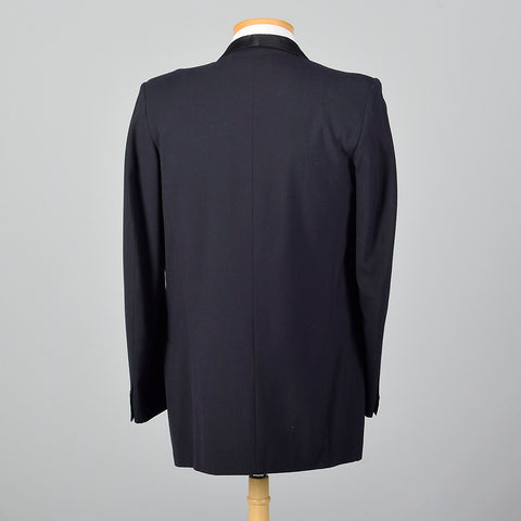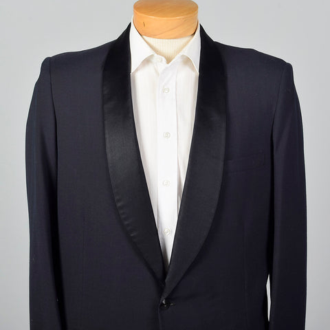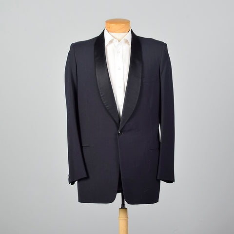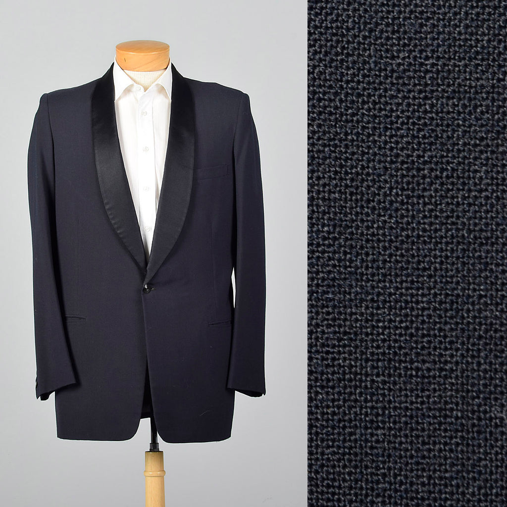 This listing is for one jacket. Textile is unmarked. Shawl collar tux jacket. Navy with a satin shawl collar, three pockets, and no back vent. Two ...