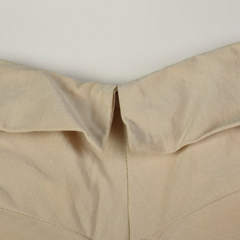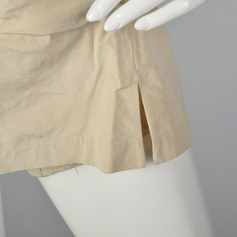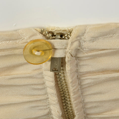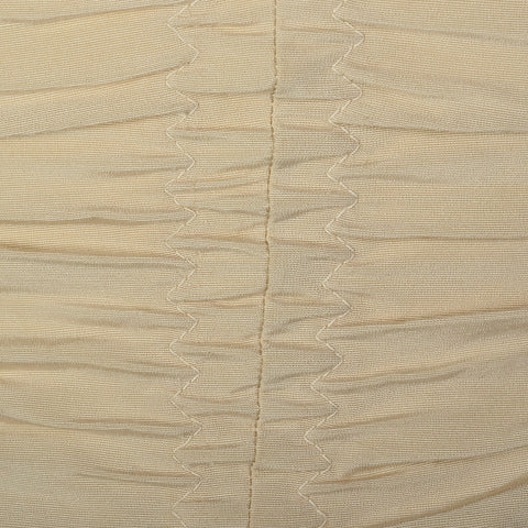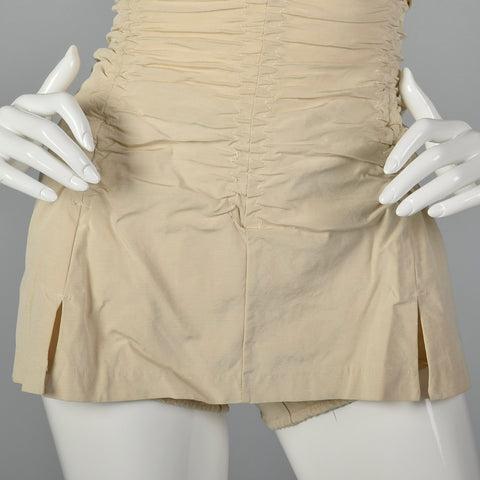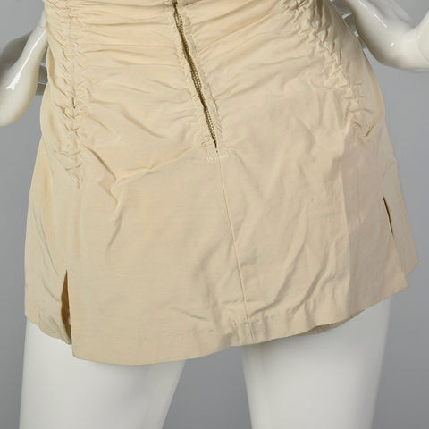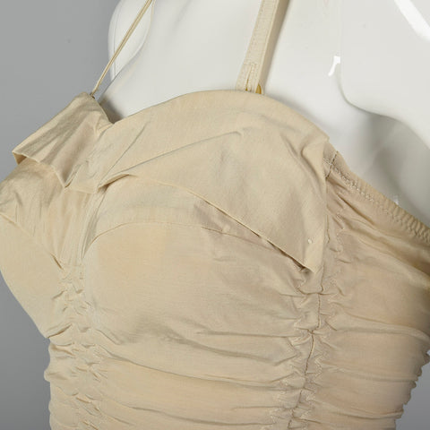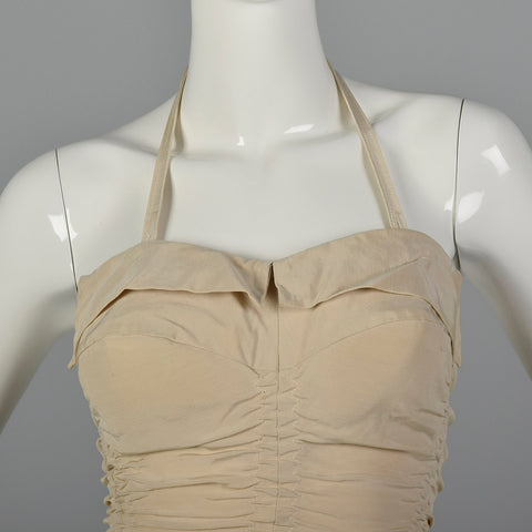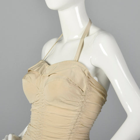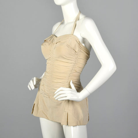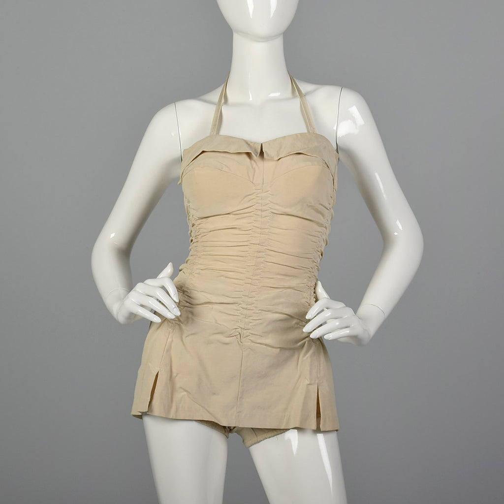 The textile of this swimsuit is unmarked, beige. This swimsuit has a removable halter strap, boning on either side of the bust, a ruched body, and ...
