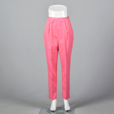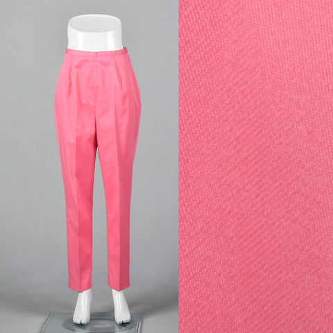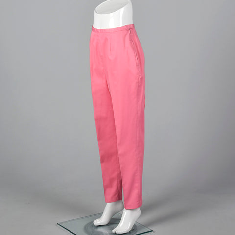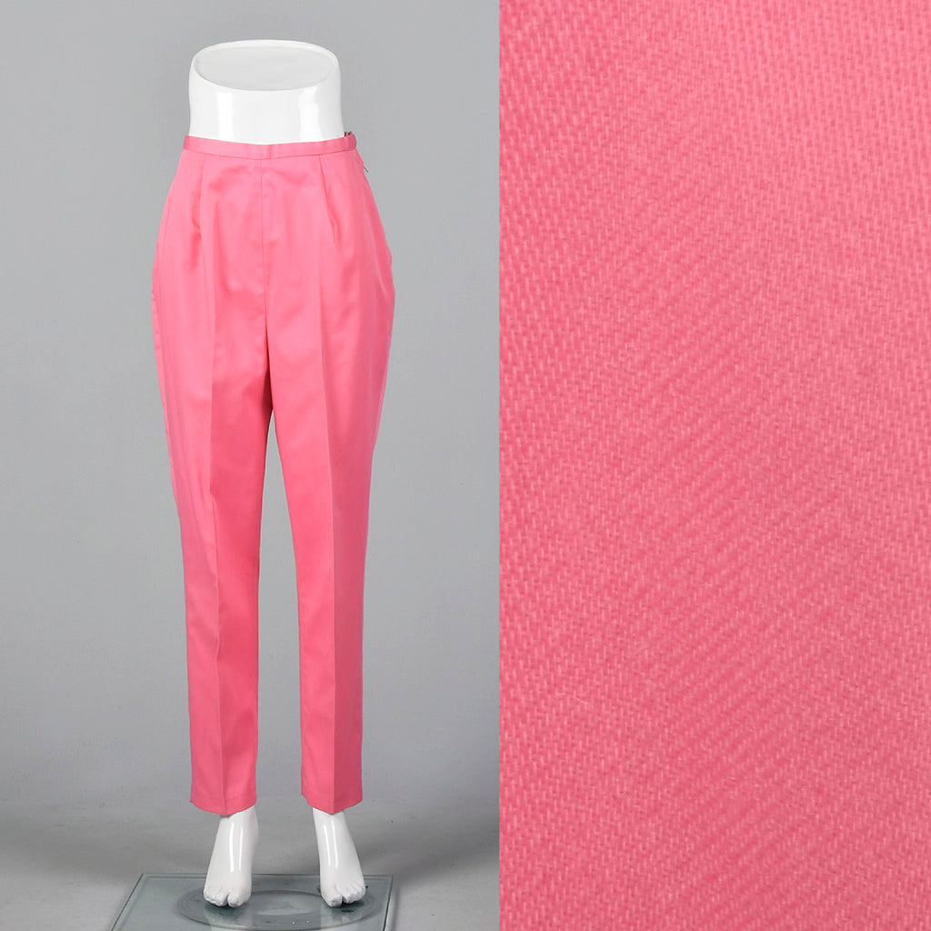 This listing is for one pair of pants. Textile is unmarked. Tapered pink pants. Full through the thighs, thin waistband, side zip. There are some l...