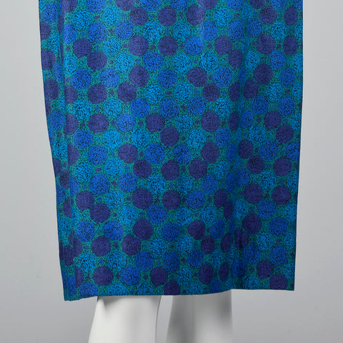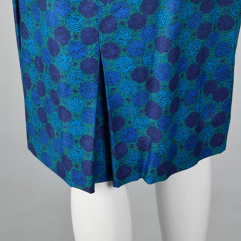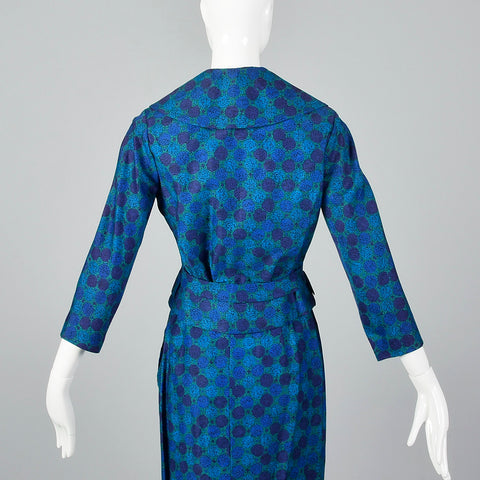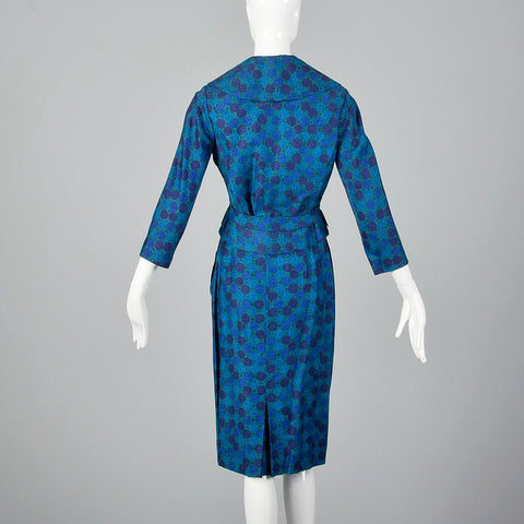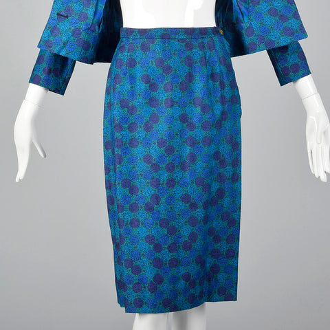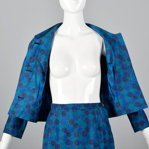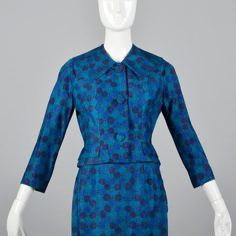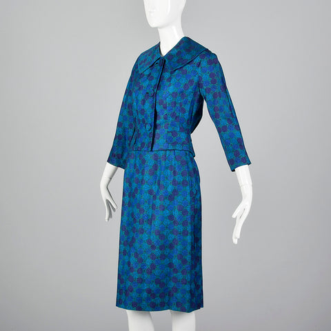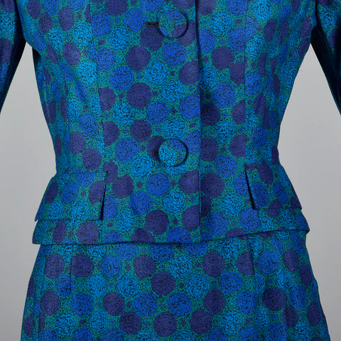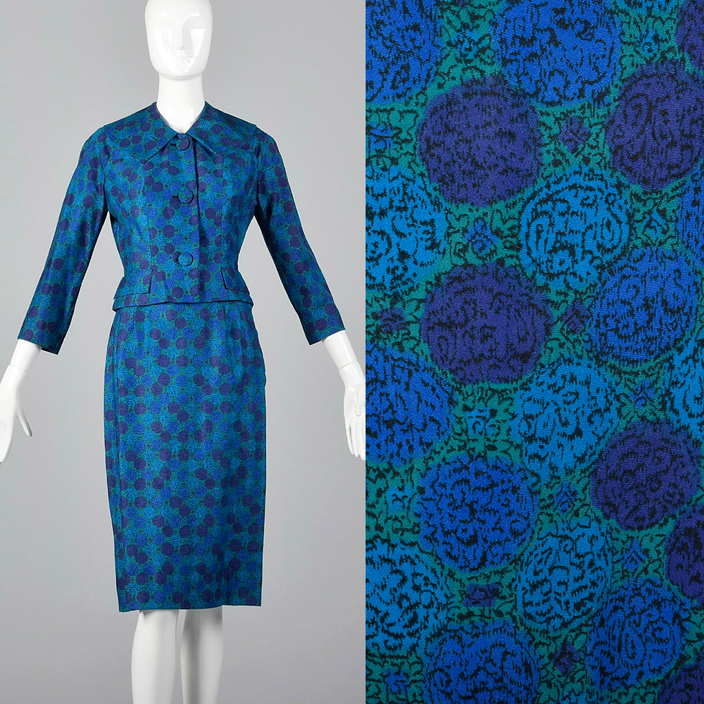 How beautiful is the print and blue shades of this 1950s skirt suit? This suit includes one jacket and one skirt. The textile is unmarked, cotton, ...