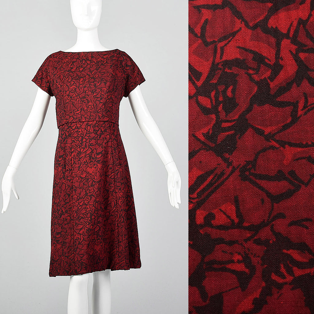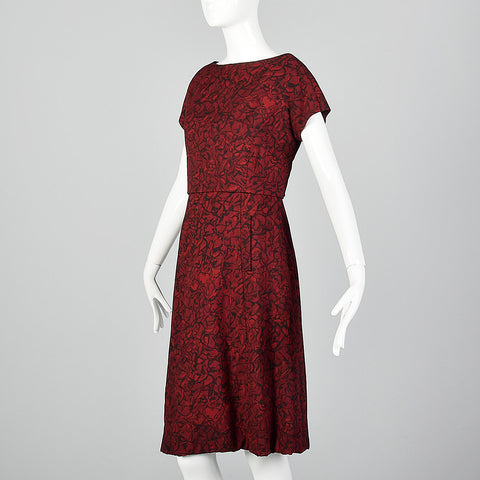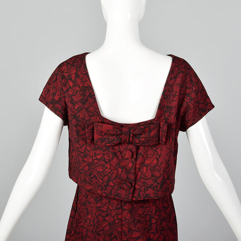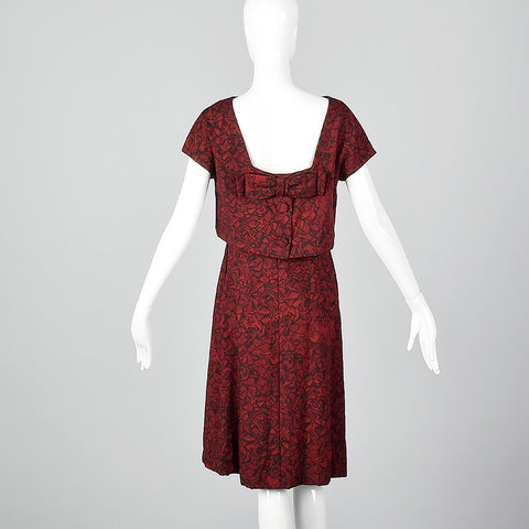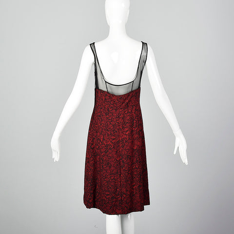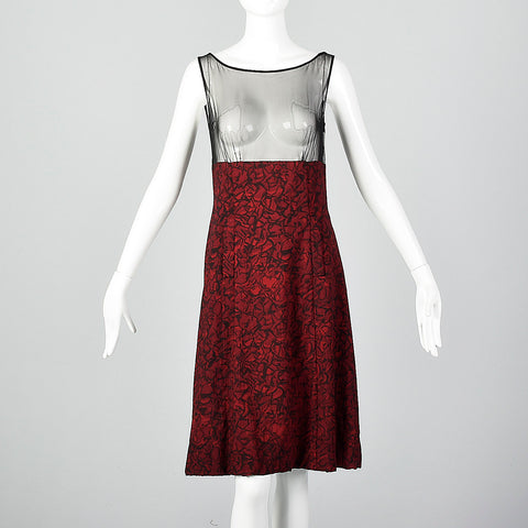 1960s Black and Red Print Dress with Mesh Bodice and Matching Overlay Top