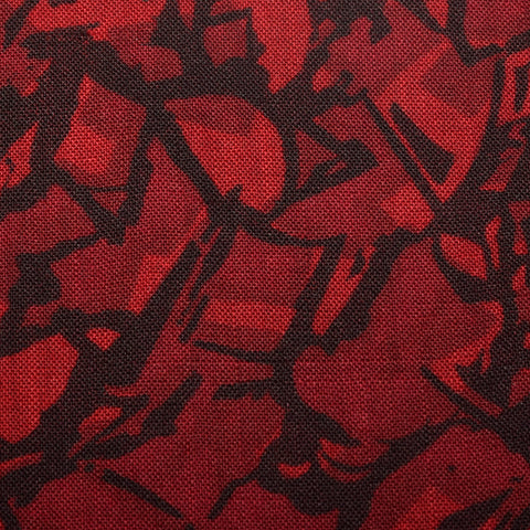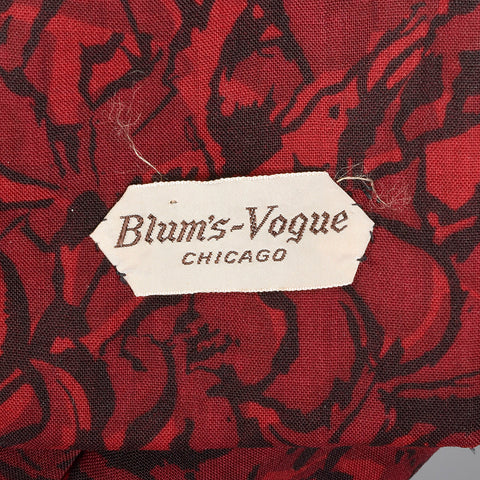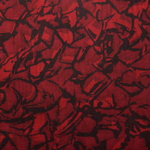 The textile of this dress is unmarked in a red and black abstract print. The dress is sleeveless with a sheer, black mesh bodice and a straight ski...
