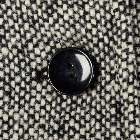 This tweed skirt suit includes one jacket and one skirt. The textile is unmarked, black and white tweed. The jacket has a button front closure, thr...