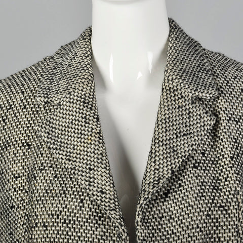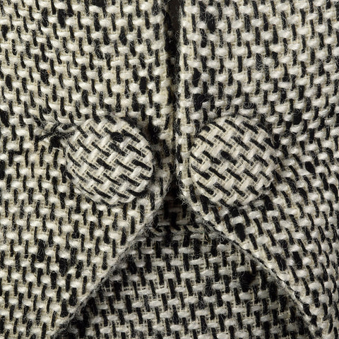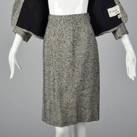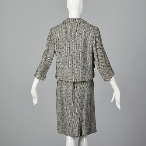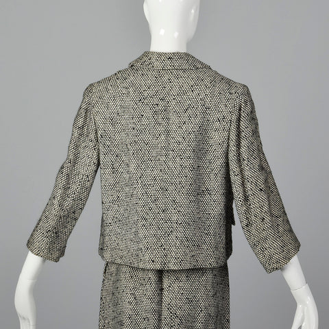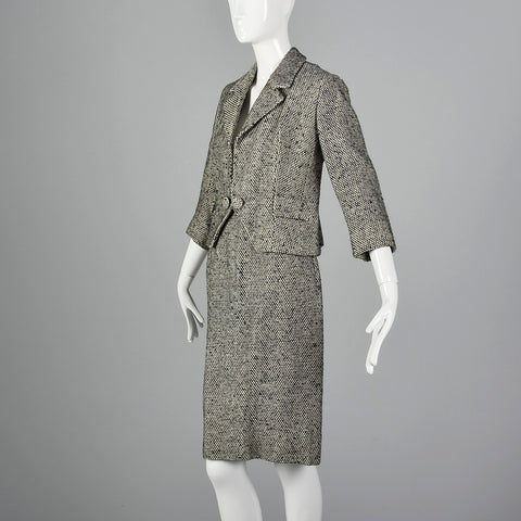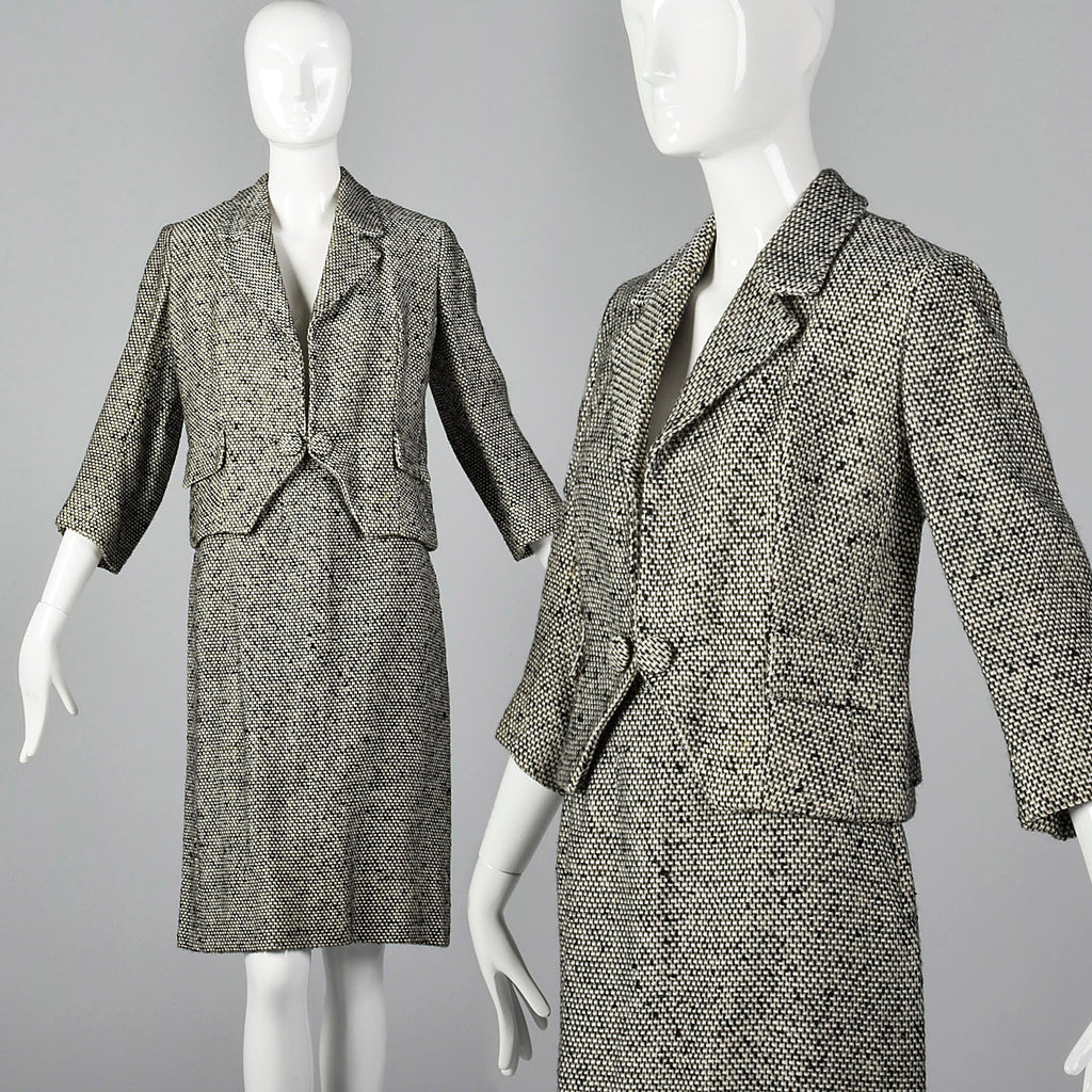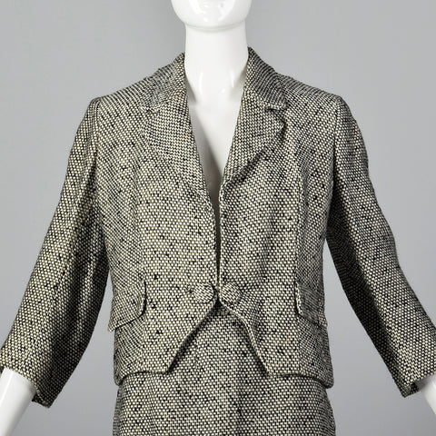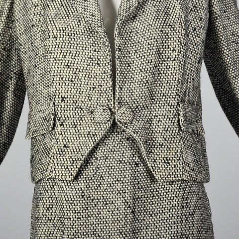 This suit includes one jacket and one skirt. The textile is unmarked, black and white tweed, and is medium weight. The jacket is fully lined with t...