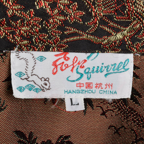 This pajama set includes one top and one pair of pants. The textile is unmarked, black, red, and gold brocade, and is lightweight. The top has shor...