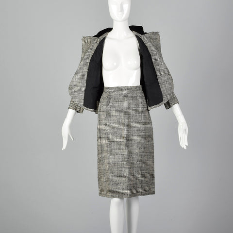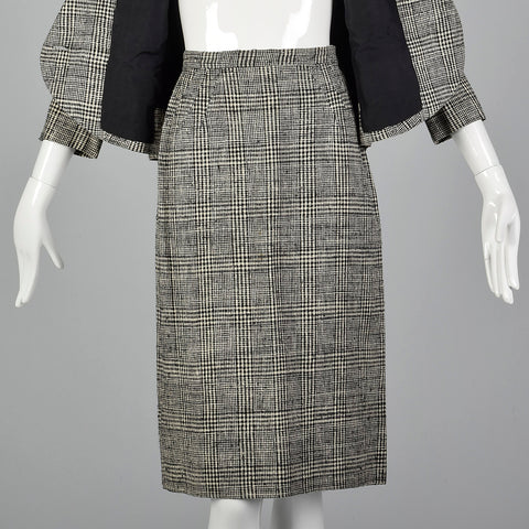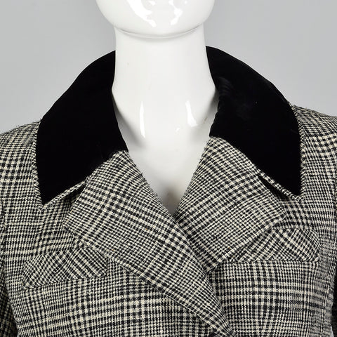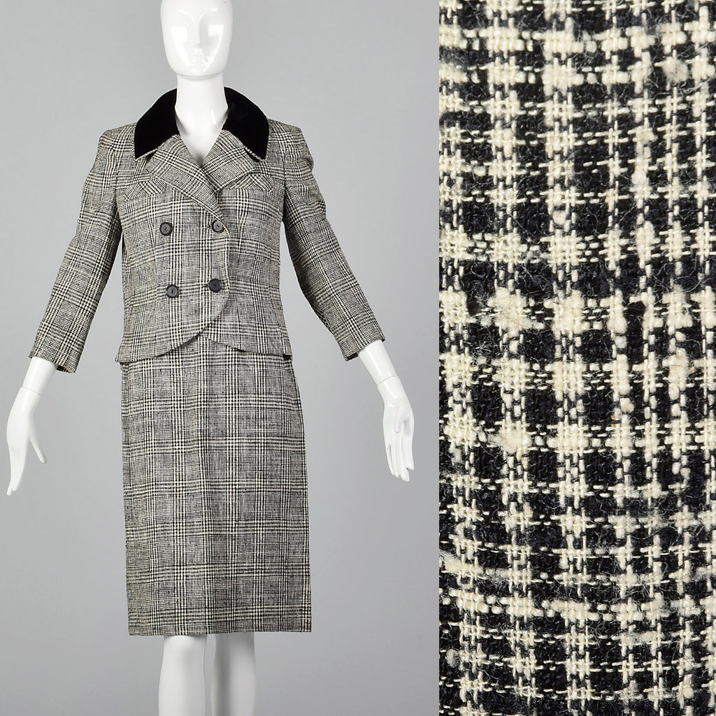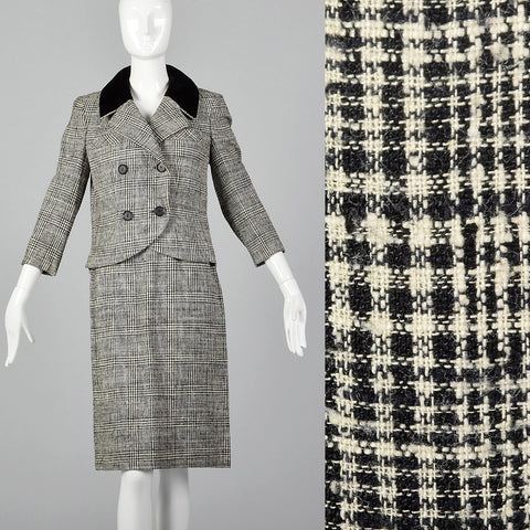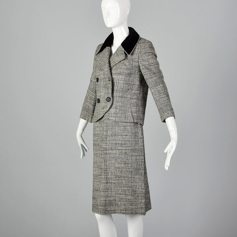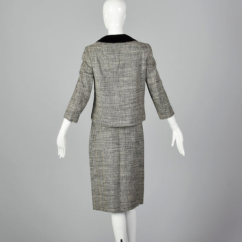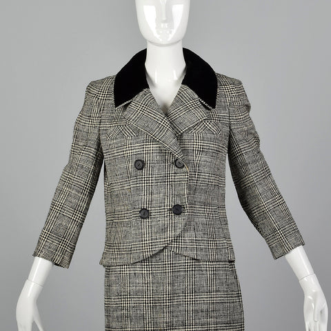 1960s Black Plaid Two Piece Skirt Suit with Velvet Collar