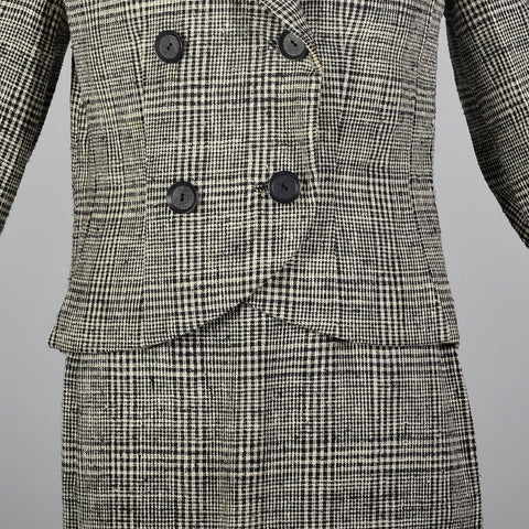 This suit includes one jacket and one skirt. The textile is unmarked, black and white plaid. The jacket has a black velvet collar, three quarter le...