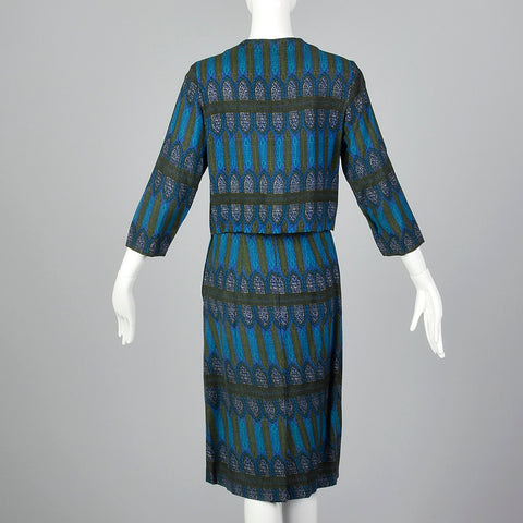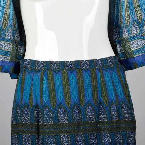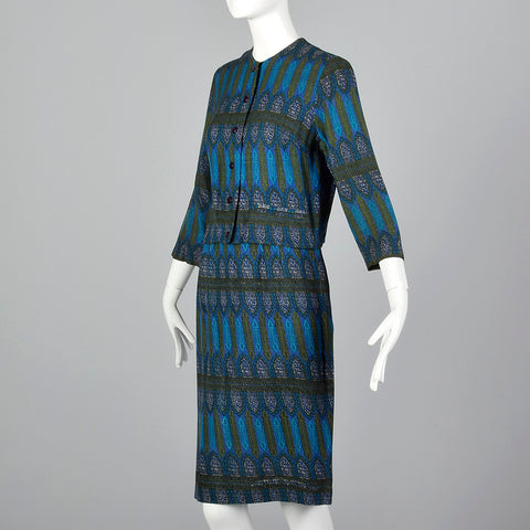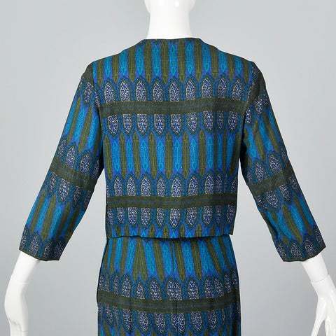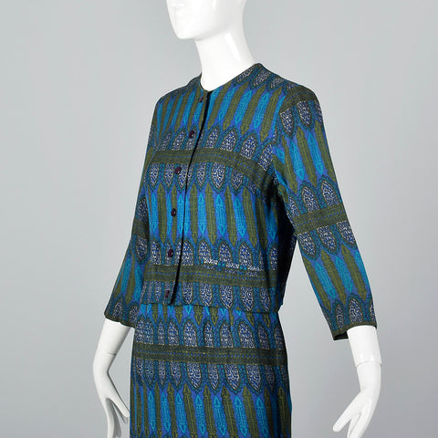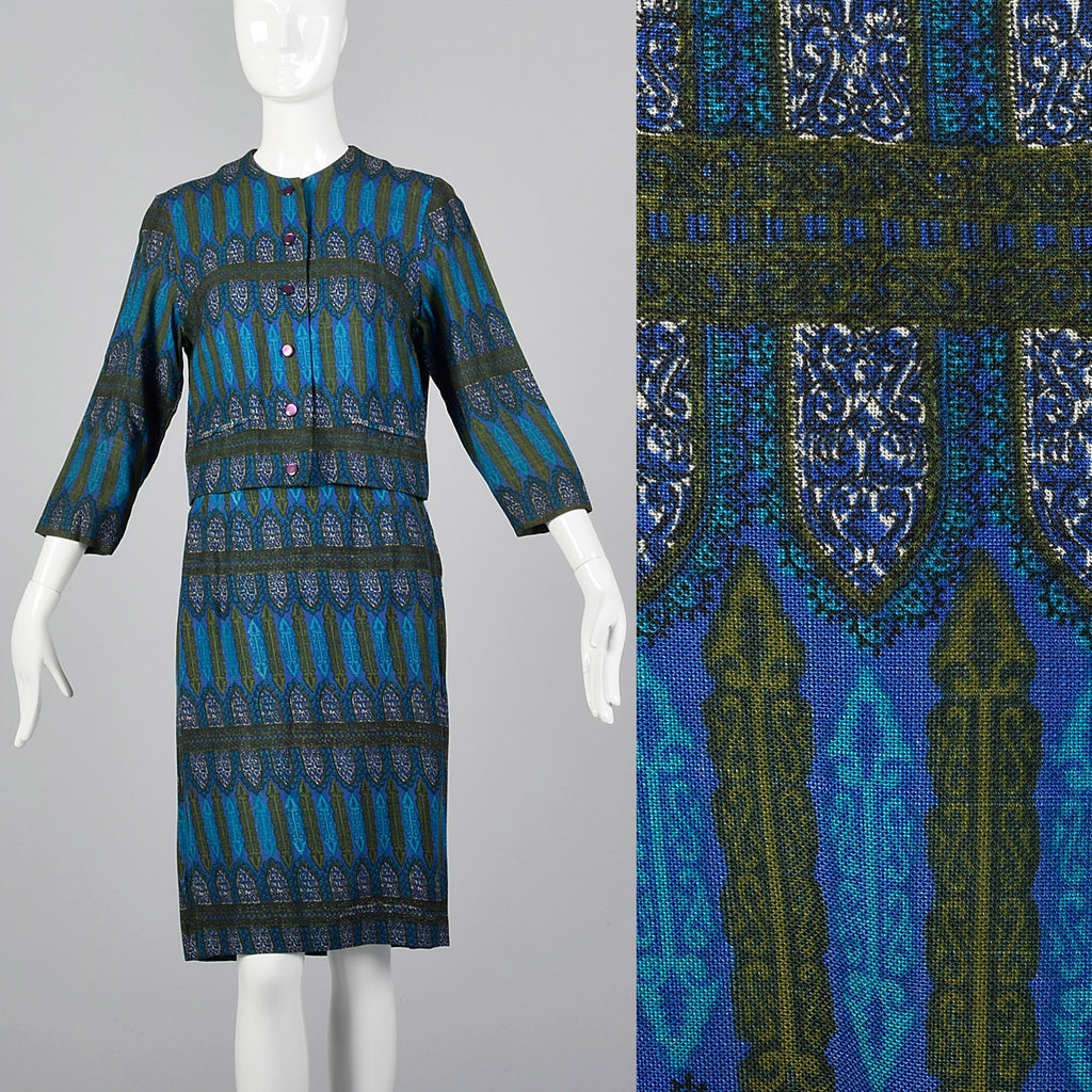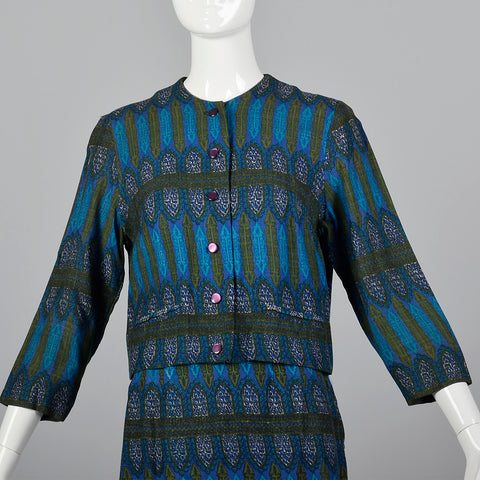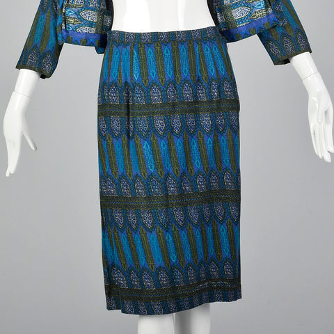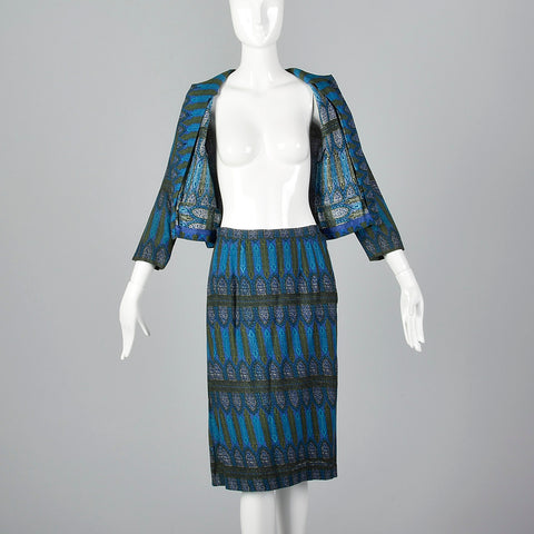 This set includes one jacket and one skirt. The textile is unmarked, rayon in a linen look, in a blue and green print. Both pieces are lightweight ...