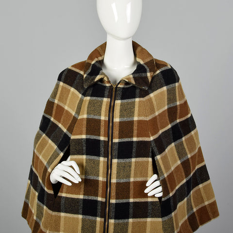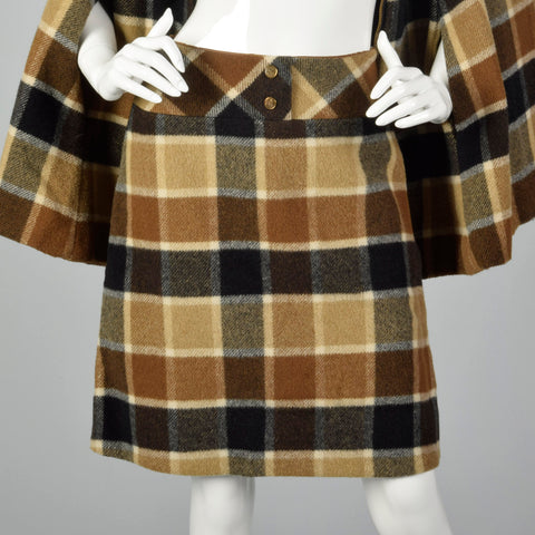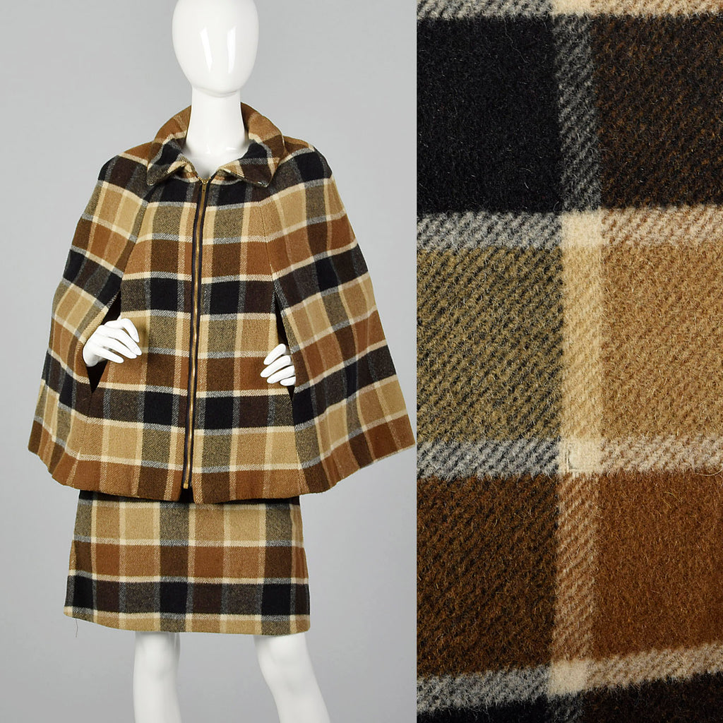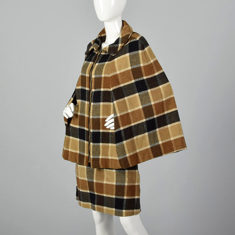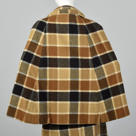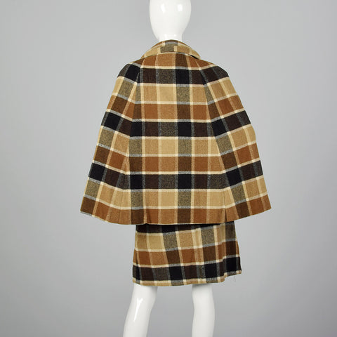 1960s Brown Plaid Skirt Suit with Cape