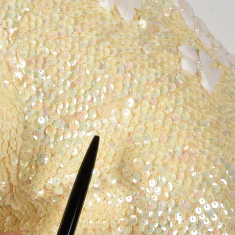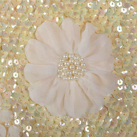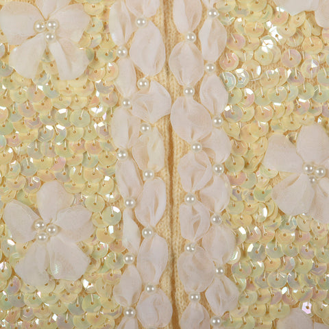 The textile of this cardigan is unmarked, cream. This cardigan has long sleeves, sequins covering the body, and woven ribbon trim and flowers. Ther...