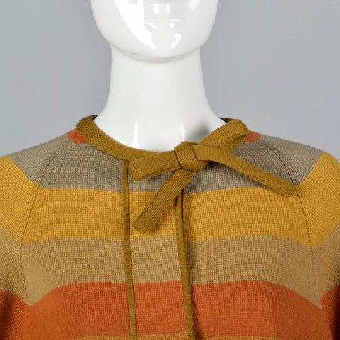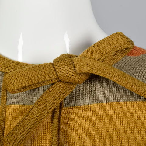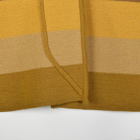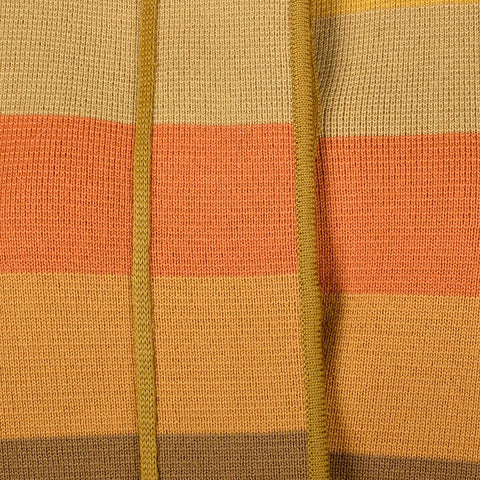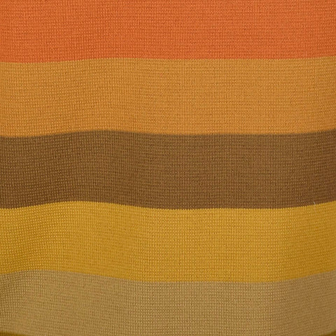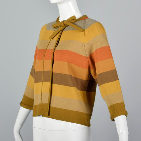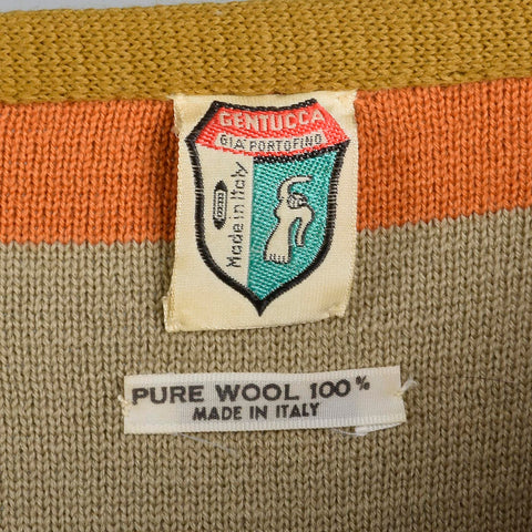 This cardigan sweater is pure wool knit in orange and mustard stripes. Cropped style closes with hidden buttons down the front.The binding at the n...
