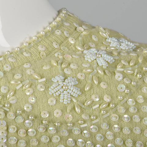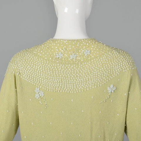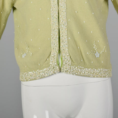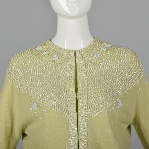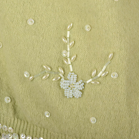The textile of this cardigan is unmarked, pale green. This cardigan has long sleeves with sequin and bead details. There is one previous repair vis...