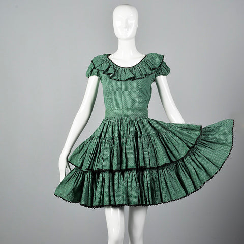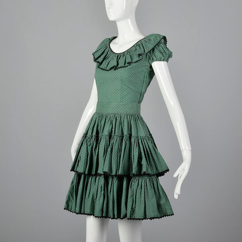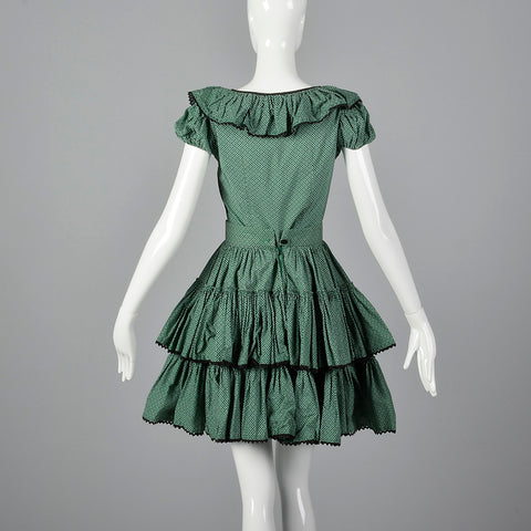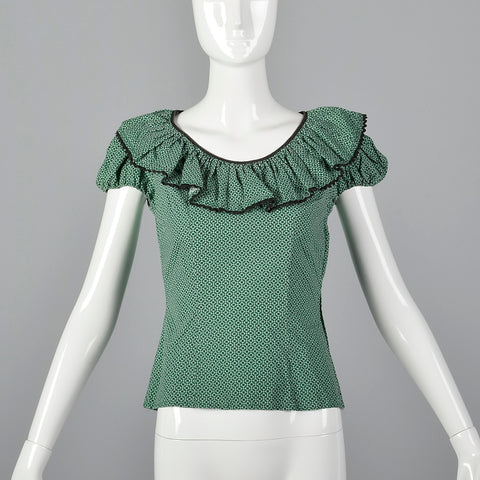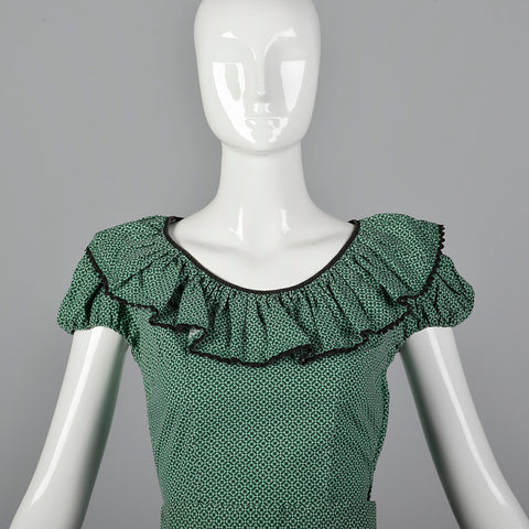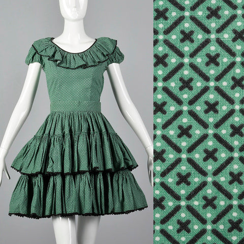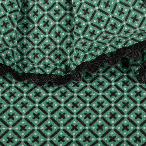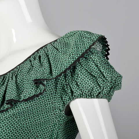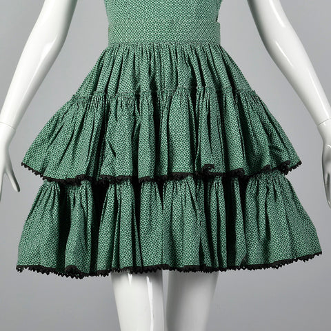 This set includes one top and one skirt. The textile is unmarked, cotton, in a green print and is lightweight. Both pieces are unlined. The top has...