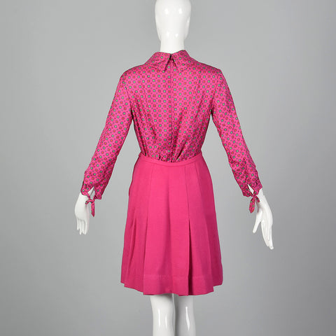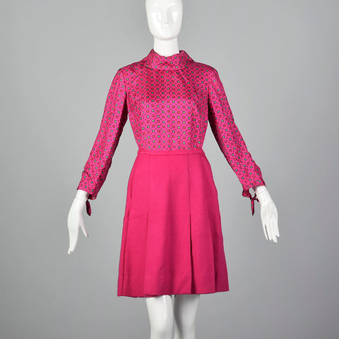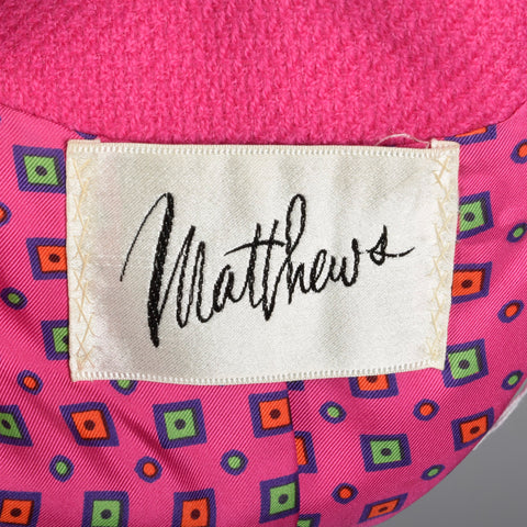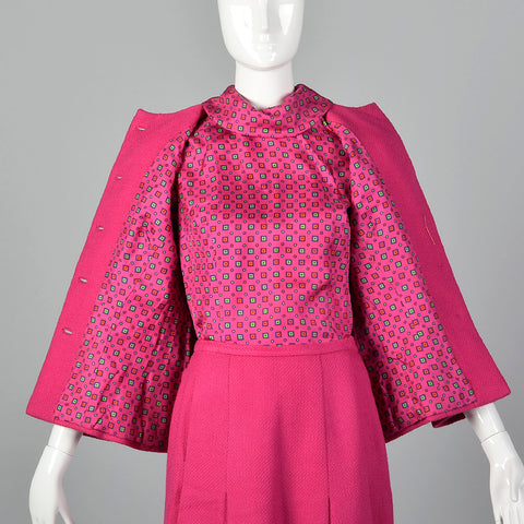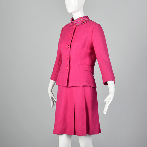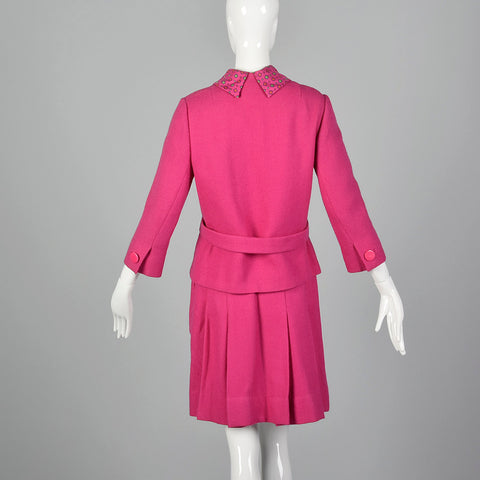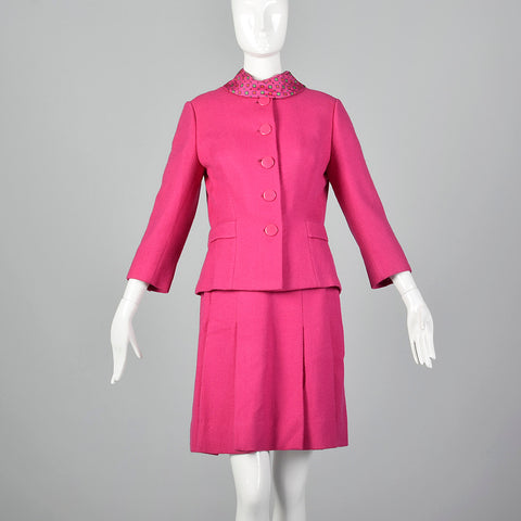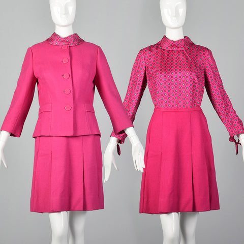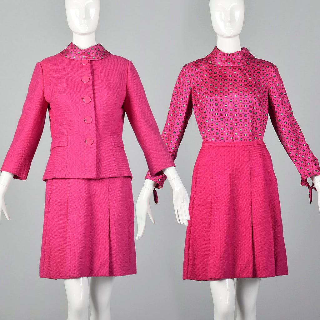 This listing is for one skirt suit consisting of a jacket, blouse, and skirt. Textile is unmarked. Hot pink 3 piece skirt suit. Blouse is pink with...