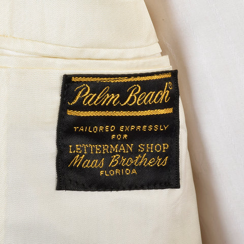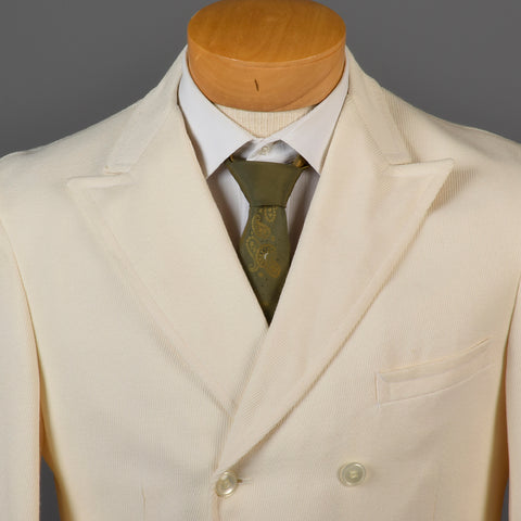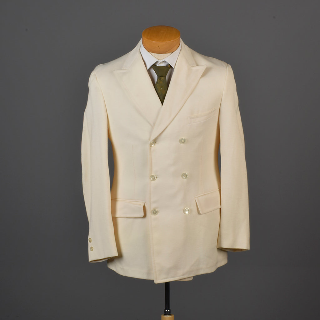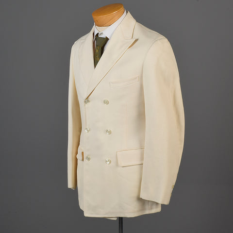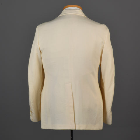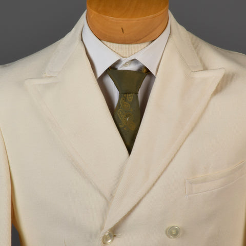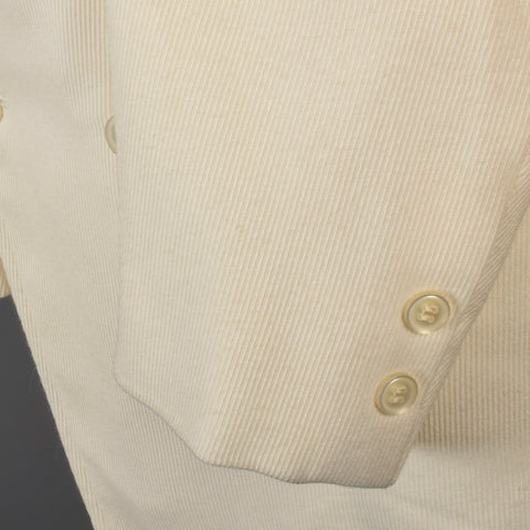 This listing is for one jacket. Textile is unmarked twill. Off-white. High cut peak lapel. 3/6 double breasted. Convertible flap pocket, partially ...