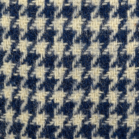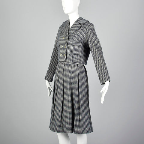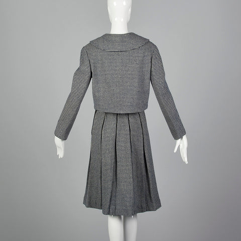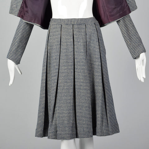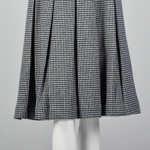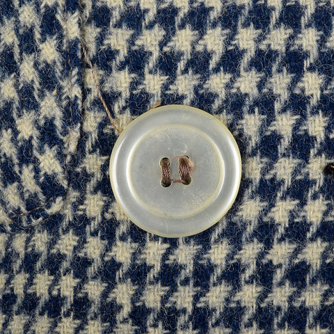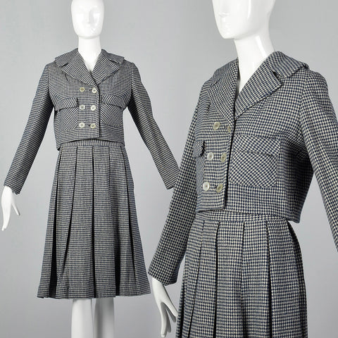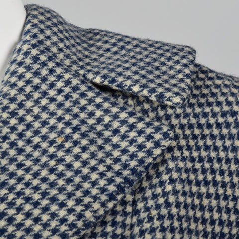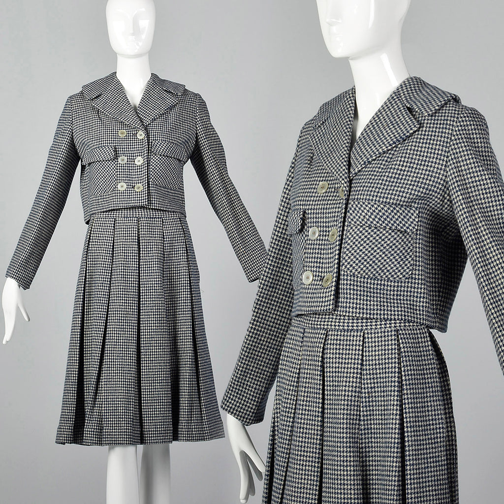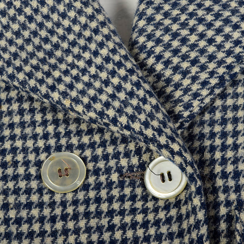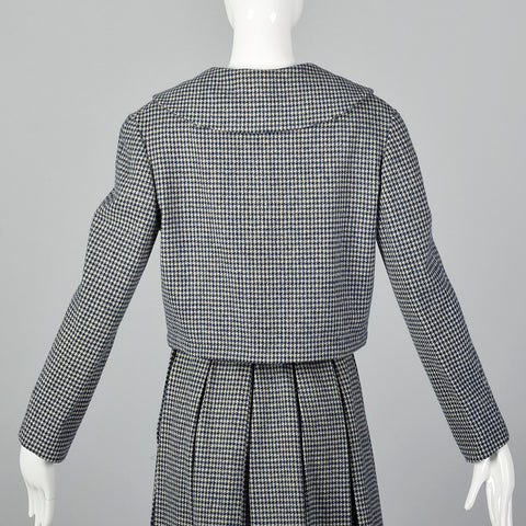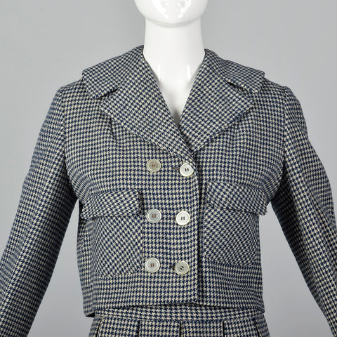 This set includes one jacket and one skirt. The textile is unmarked, wool, in a blue and white houndstooth pattern. The jacket is lined with a crop...
