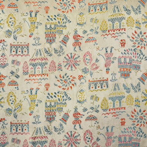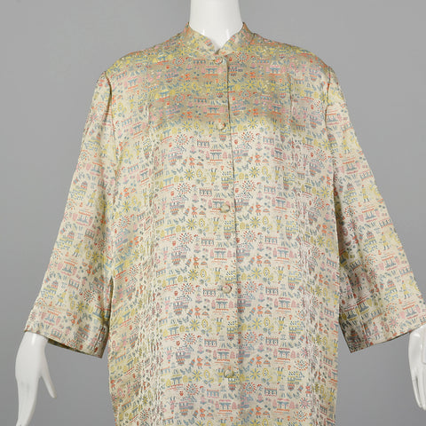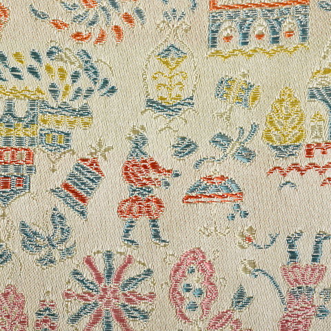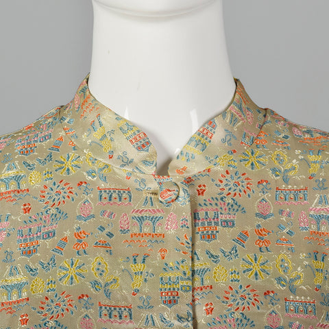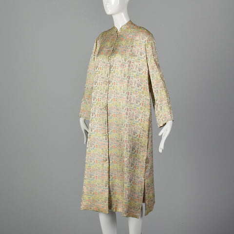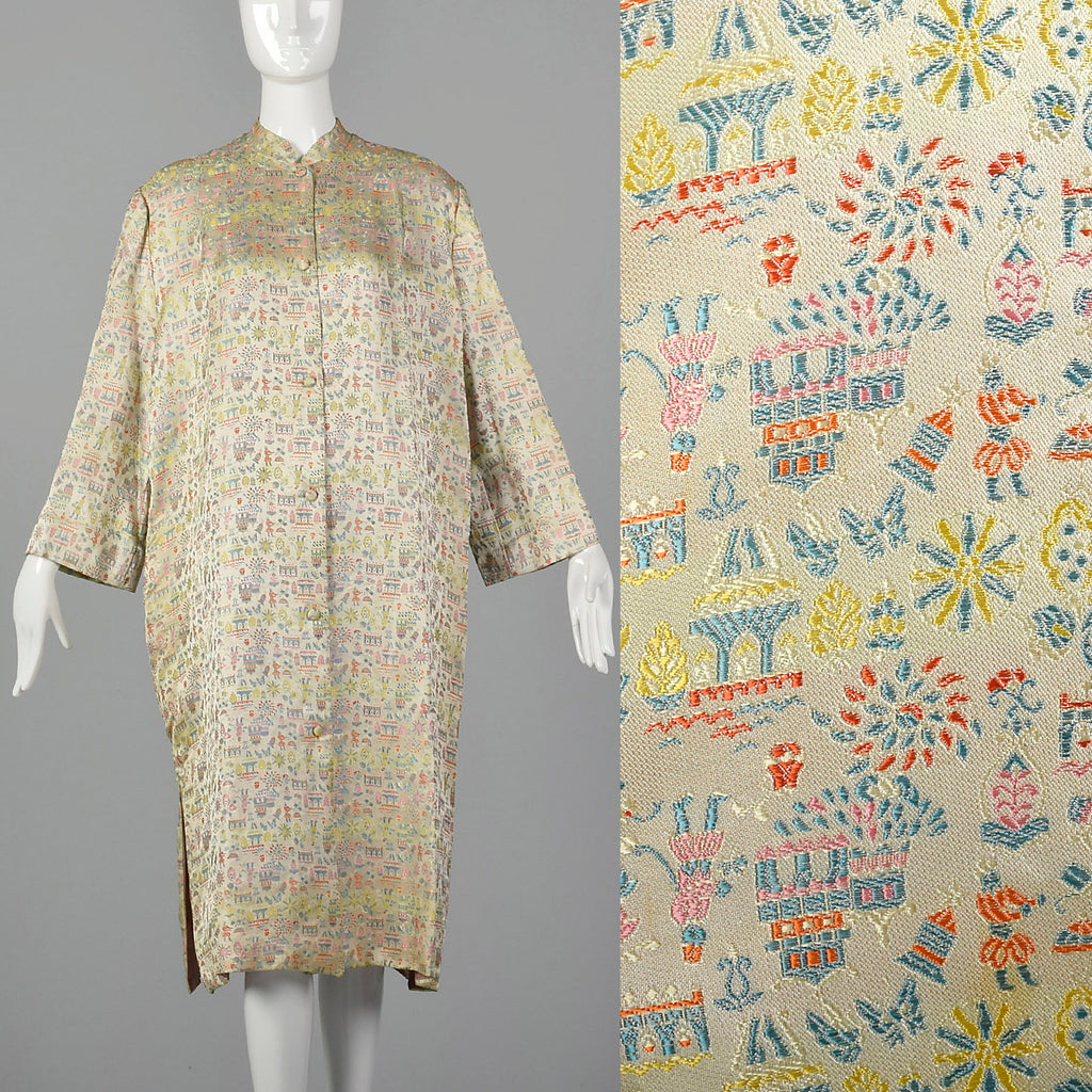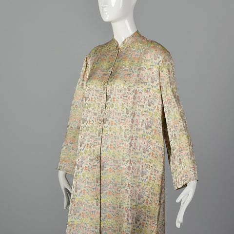 The textile of this coat is unmarked, gold, with a multicolor figural brocade. This coat is lightweight and is appropriate for spring weather wear....
