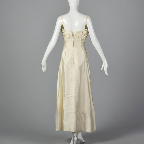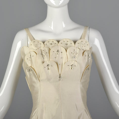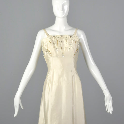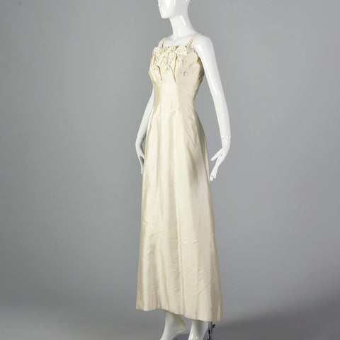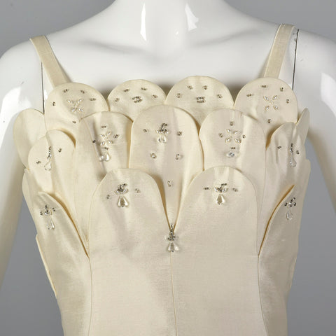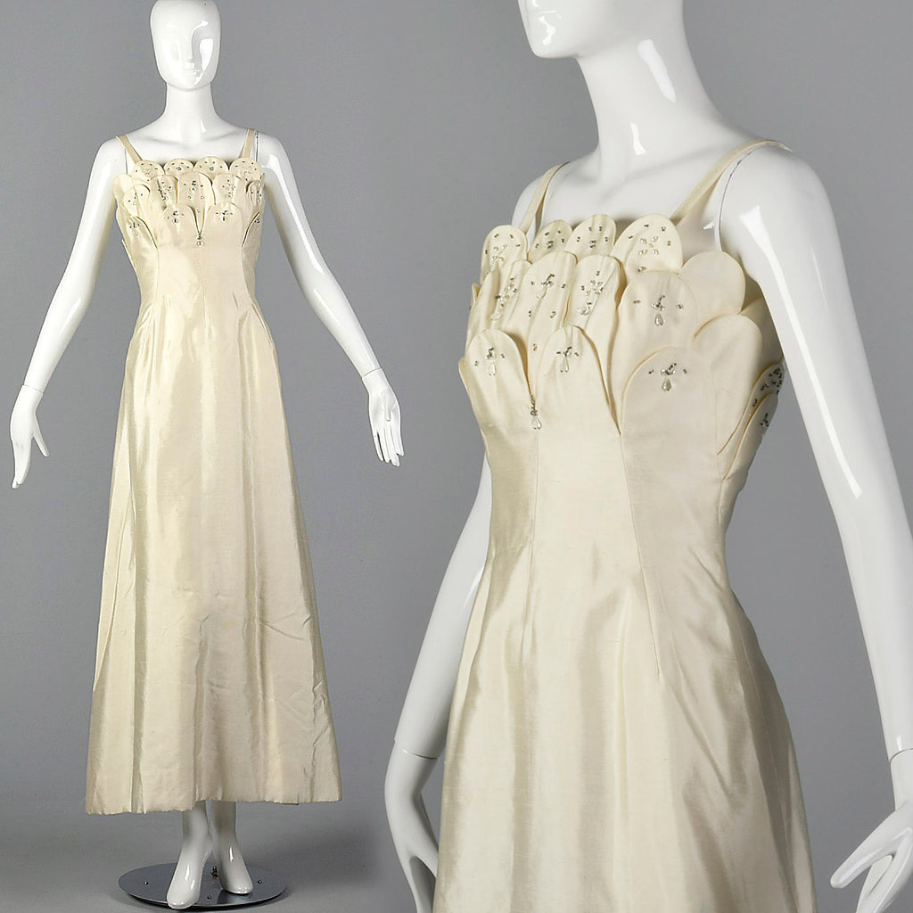 This 1960s dress has the most unique and beautiful bodice. It would make a lovely wedding dress!  This listing is for one dress. The textile is un...