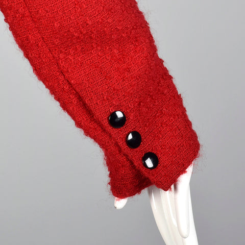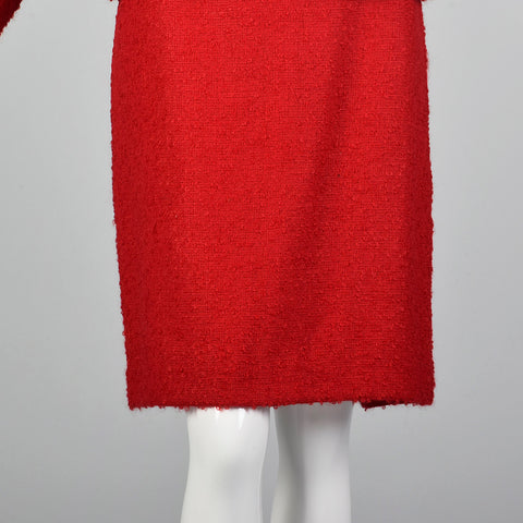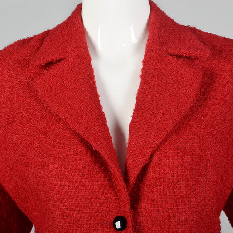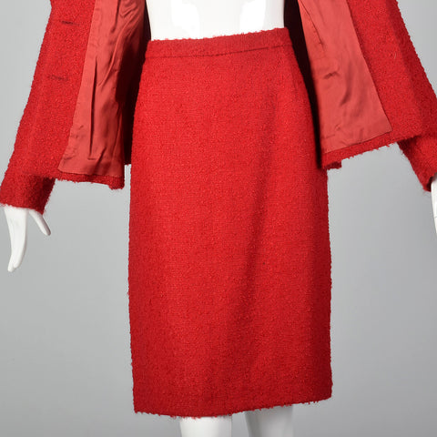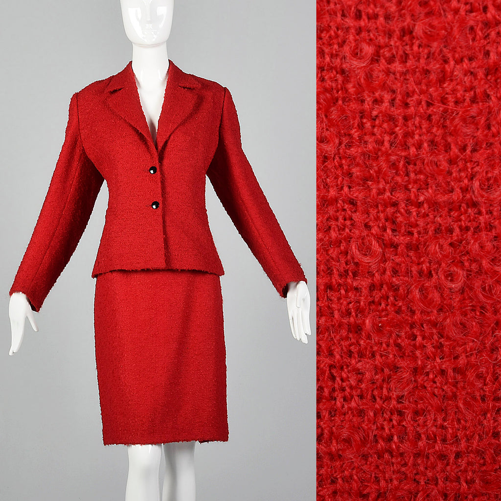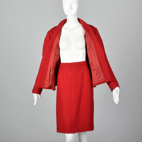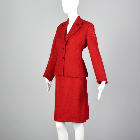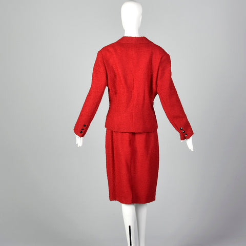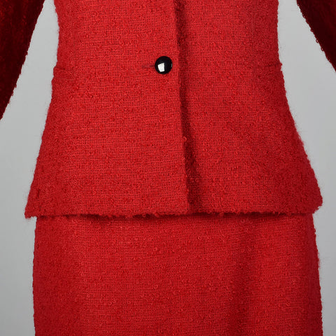 This suit includes one jacket and one skirt. The textile is unmarked, red wool. The jacket has long sleeves, shoulder pads, decorative buttons at t...