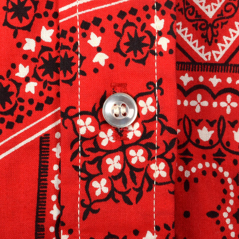 The textile of this dress is unmarked, cotton in a red bandana print, and is lightweight. This dress is unlined and sleeveless with a button front ...