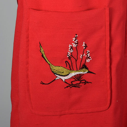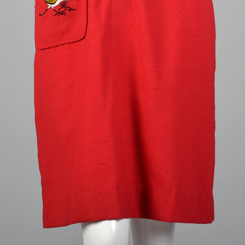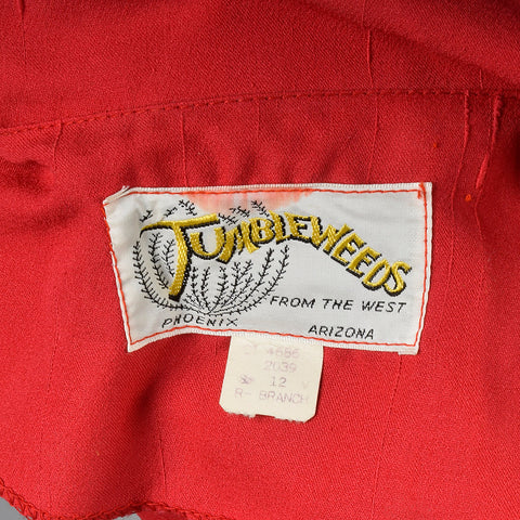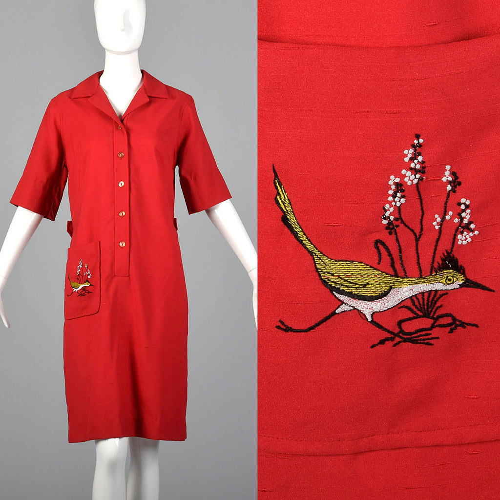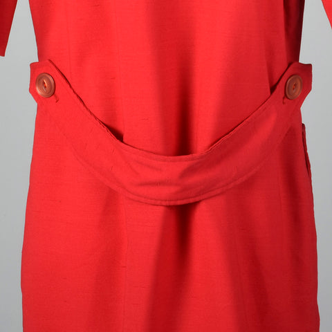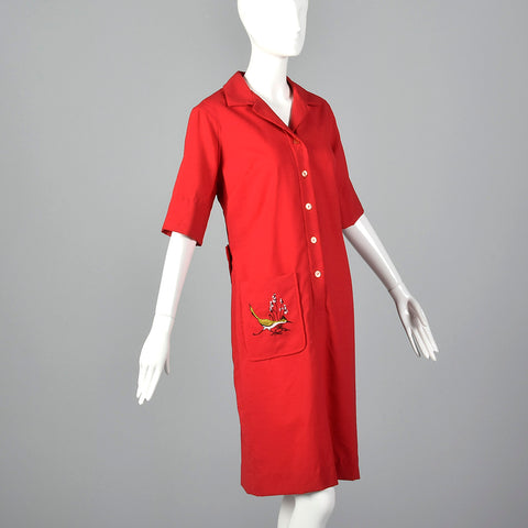 The textile of this dress is unmarked, red, and is very lightweight. This dress is unlined with short sleeves, a button front, and a belted back. T...