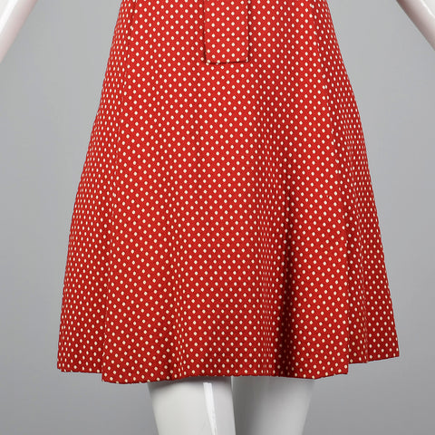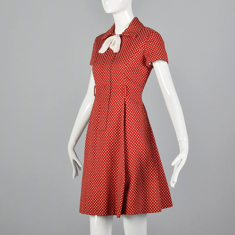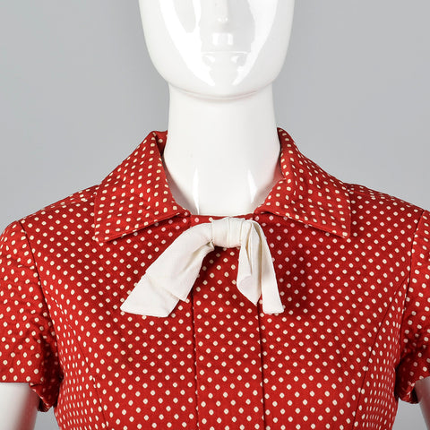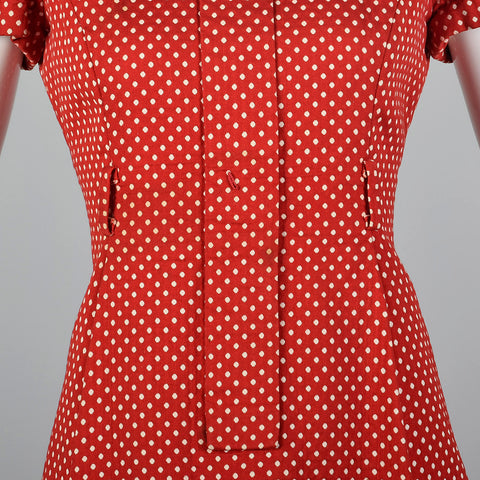 This listing is for one dress. The textile is unmarked, red with white polka dots, and is lightweight. This dress is fully lined with short sleeves...