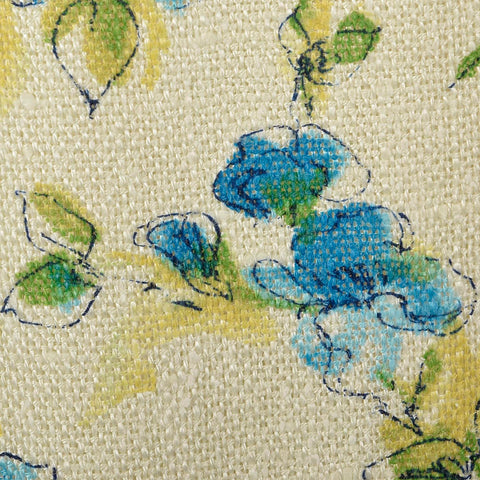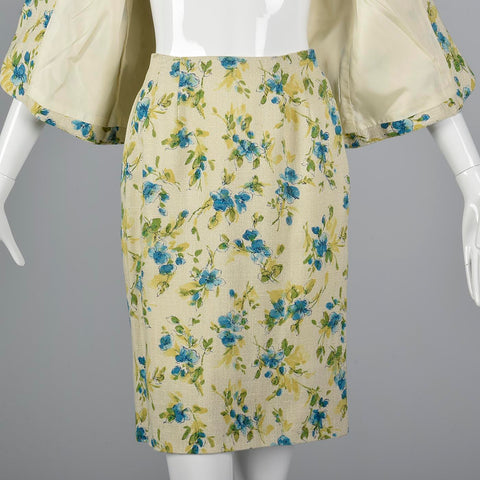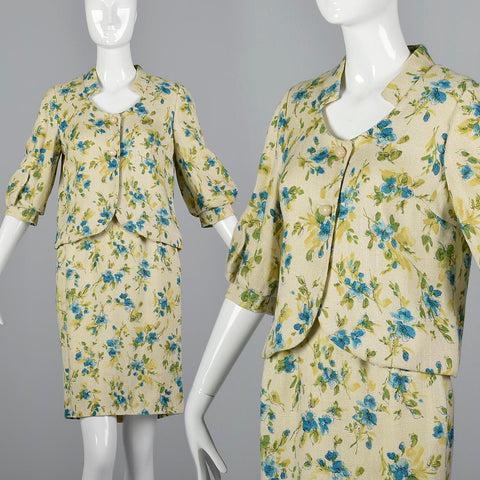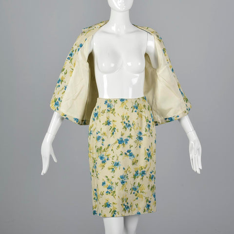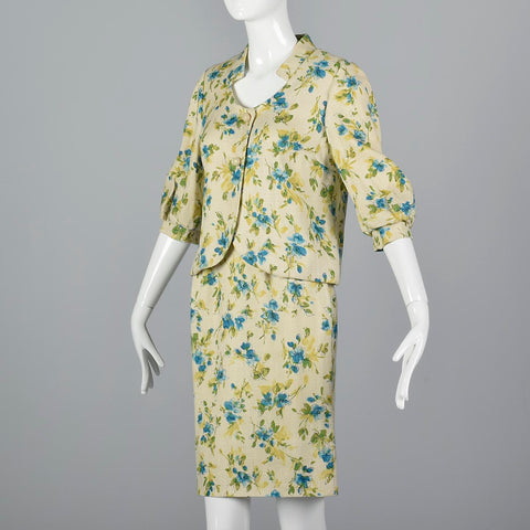 This suit includes one jacket and one skirt. The textile is unmarked, beige with a green and blue floral print, and is very lightweight. Both piece...