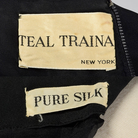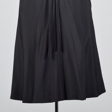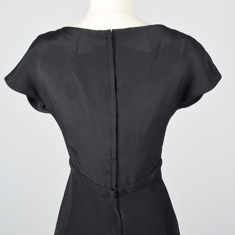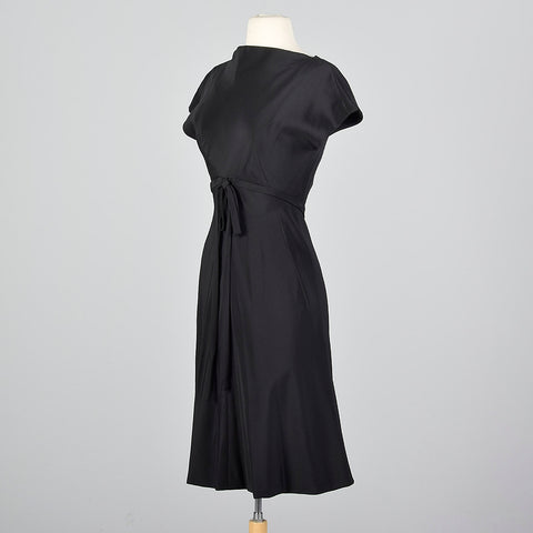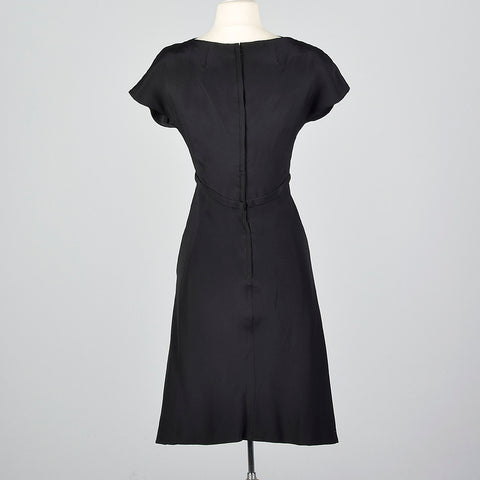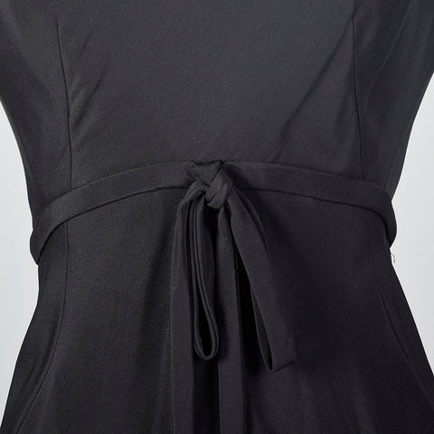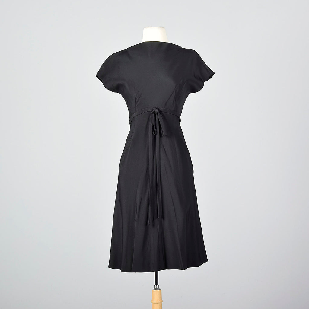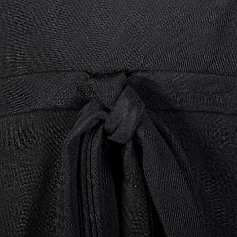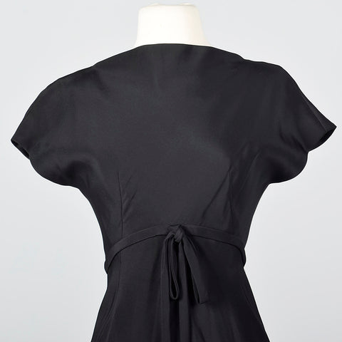 The textile of this dress is 100% silk in black and is lightweight. This dress has short sleeves, a decorative bow at the waist, and a bias cut ski...