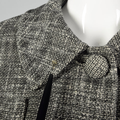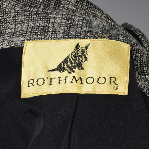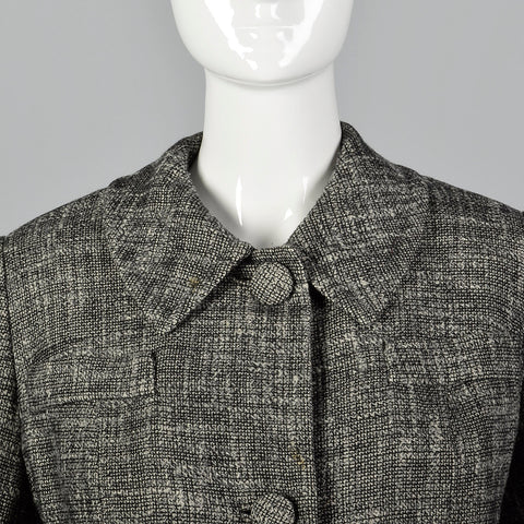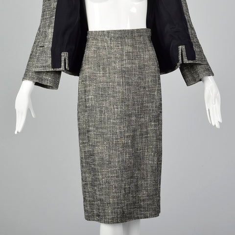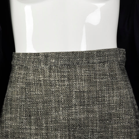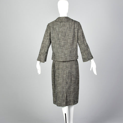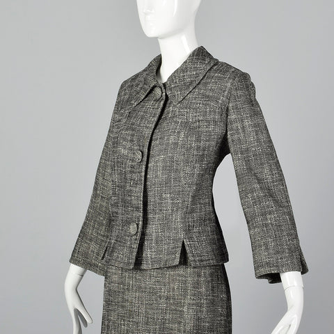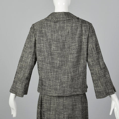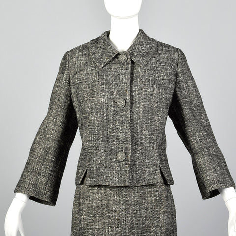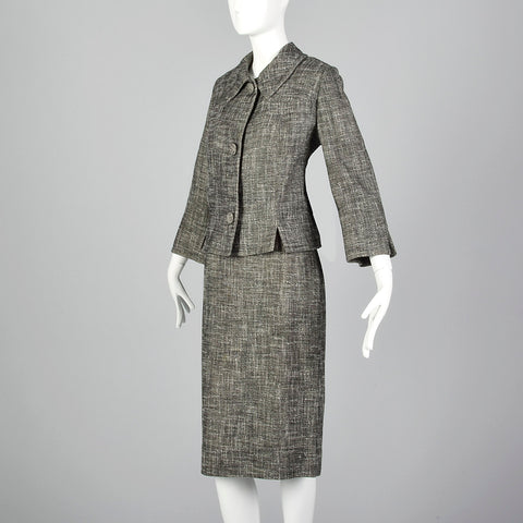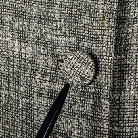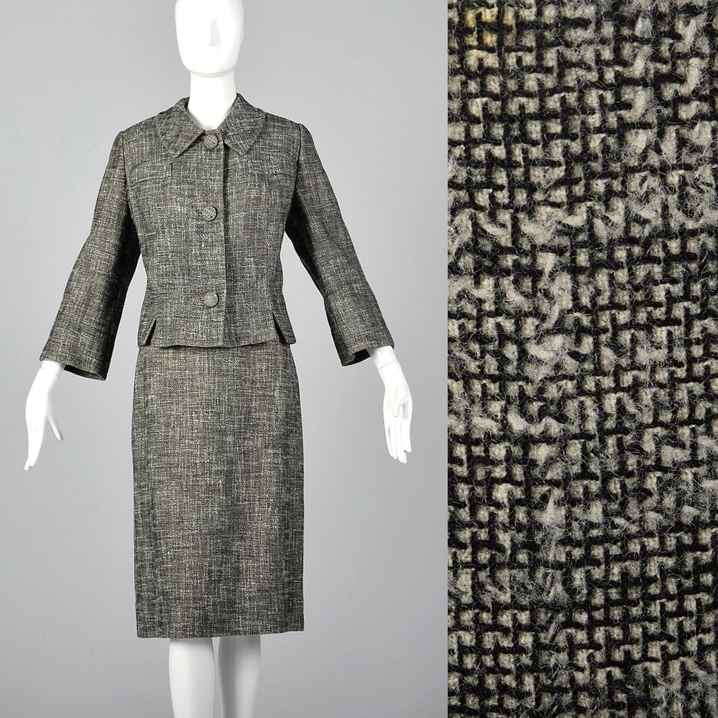 This listing is for one suit, which includes one jacket and one skirt. The textile is unmarked, wool tweed, in black and white. The jacket has thre...