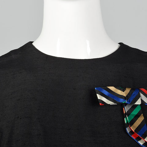 This set includes one top and one skirt. The textile is unmarked, black rayon, with black nubby flecks throughout the textile. The top has short sl...